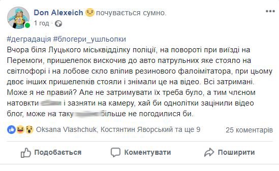 Всі злючі, що враження, що аж від власної злості скоро самі себе покусають. Та, блін, зняли б того фалоса гумового, викинули у смітник і сказали подумки чи вголос навіть, якщо легше б від того стало "що з дурнуватих візьмеш" та й по всьому. Так ні, просто таки операція " план-перехват" і кримінальна справа. Дурні звичайно і витівка дурнувата, але в порівнянні з тим, як кілька місяців тому інші "діточки" розважались кидаючи в проїзджаючі авто глиби льоду і поліцейську машину теж таким чином припечатали, а "діточок" ще тоді й жертвами зробили, бо в них "таточко" крутий виявився і сто відстоків зам"яли все і спустили на гальмах, то тут справді просто тупа витівка і все, яка шкоди і загрози нікому не несе, а тому й піднятої шумихи не варта. Зайнятись нема чим всім.