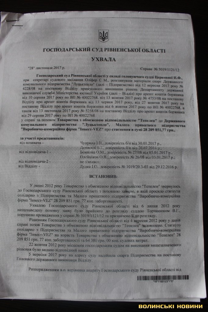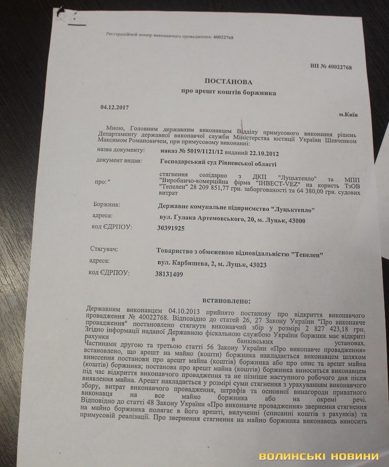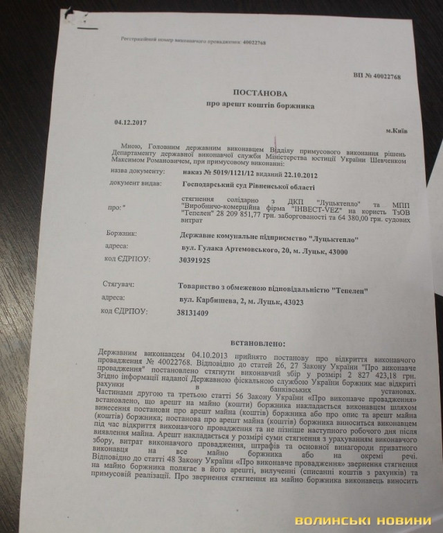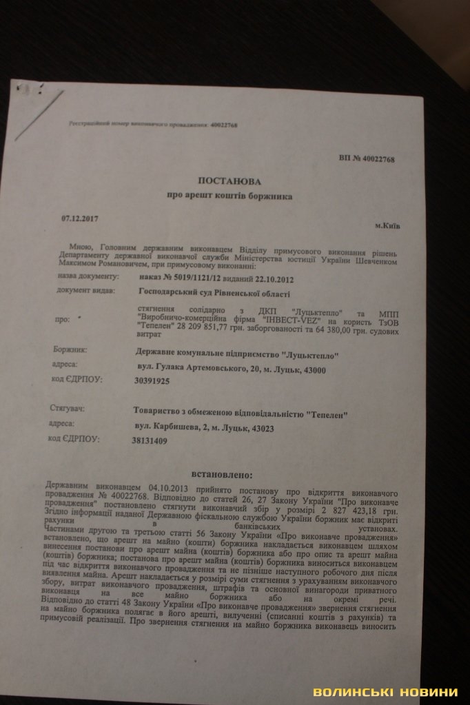 Також директор підприємства зазначила, що жодних інших стягнень, як окрім на користь «Тепелена», в «Луцьктепла» немає.