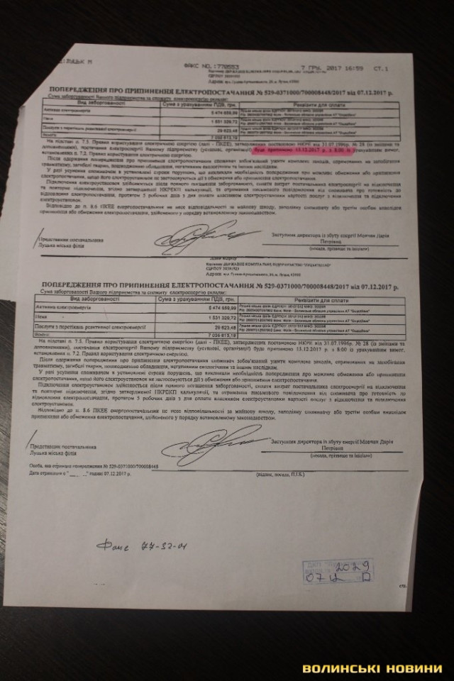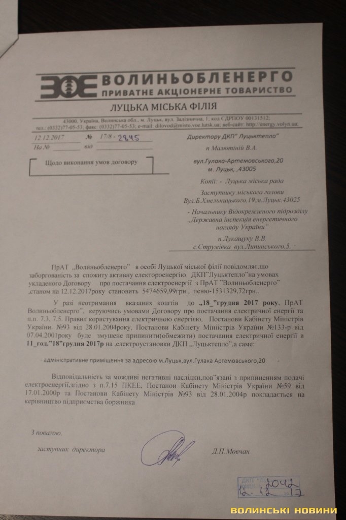 Наразі підприємство має попередження від ПрАТ «Волиньобленерго» про припинення електропостачання на об’єкти. Якщо найближчим часом Міністерство юстиції України, в особі його виконавчої служби, найближчими днями не виконає законну ухвалу, то це може призвести до зупинки опалювального сезону, аварійного транспорту та гарячого водопостачання.