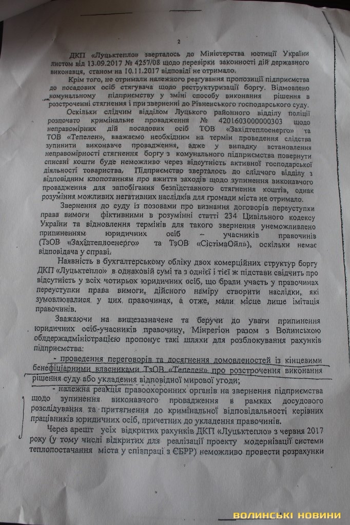 «Первинний борг перед «Тепеленом» складав 28,2 мільйони гривень, наразі підприємство виплатило «Тепелену» вже 3 мільйони, а найближчими днями з рахунків «Луцьктепла» знову буде списаний 1 мільйон 200 тисяч гривень на користь цієї компанії. Не можна в опалювальний сезон ставити на одні ваги інтереси громади та інтереси «Тепелену», щодо якого відкрита кримінальна справа. Зокрема, йдеться про провадження, як компанія набула права стягнення коштів. Ця фірма явно не платить податки ні в місцевий бюджет, ні в будь-який інший. Втім, стягнення з підприємства і надалі продовжуються, арешт з рахунків не знятий», - каже пані Малютіна.