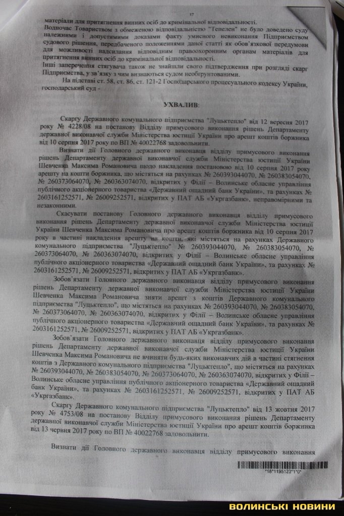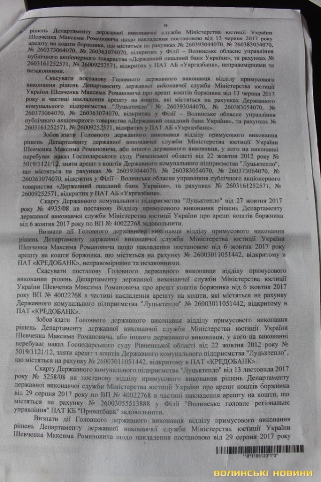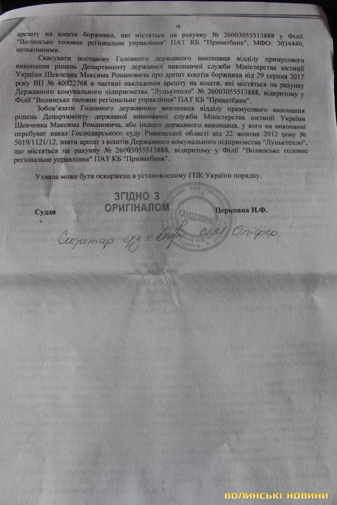 «Суд прийняв однозначне рішення: скаргу задовольнити, скасувати постанову в частині арешту рахунків і зобов’язати Головного державного виконавця відділу примусового виконання рішень Департаменту державної виконавчої служби Міністерства юстиції України Максима Шевченка внести зміни у постанову про арешт рахунків ДКП «Луцьктепло» та заборонити йому списувати кошти з рахунків підприємства. Ухвала суду – це документ, який виконується при прийнятті, втім наразі ухвала не виконана і рахунки досі заблоковані», - з відчаєм говорить Валентина Малютіна.