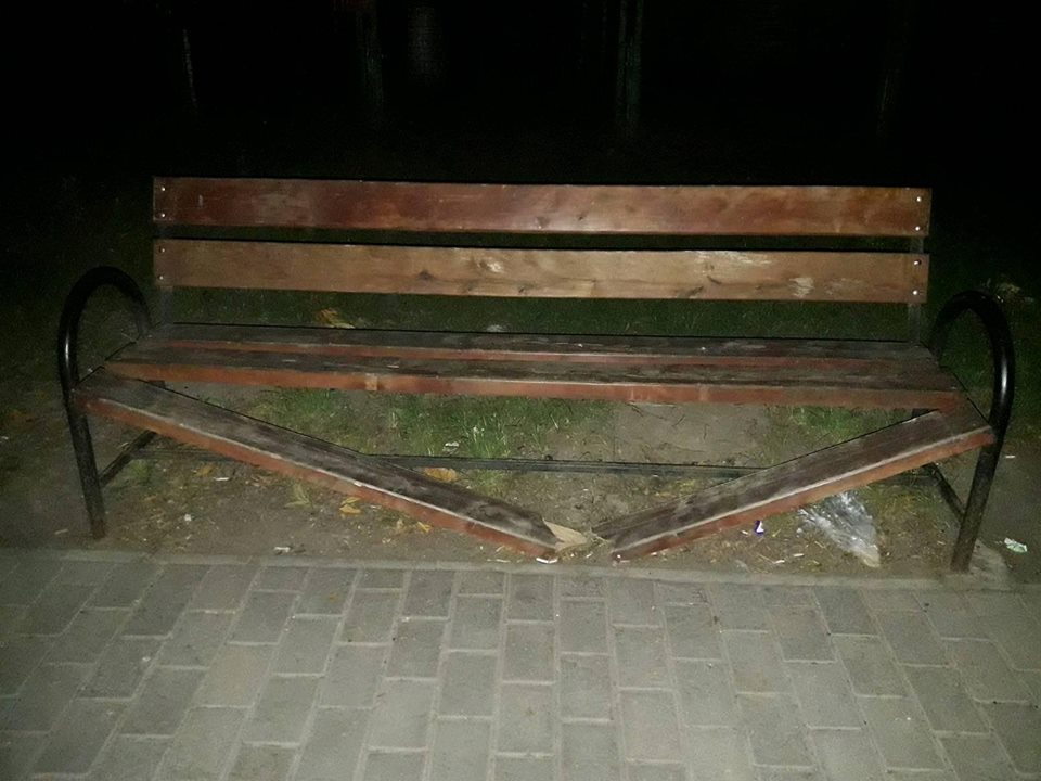 Та лавка сама зламалася там мамочка з каляскою сідала і вона впала. Доска була неякісна там видно що сучок посередині доски от вона і невитримала вагу. її ніхто не хотів зламати.
