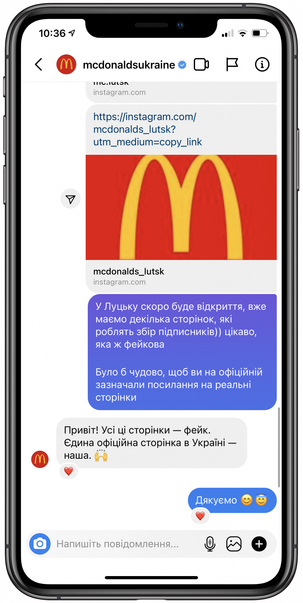 Як повідомила SMM-спеціалістка Ірина Гаранчевська, яка написала повідомлення до офіційної сторінки закладу в Україні: «Усі сторінки – фейк. Єдина офіційна сторінка в Україні – наша».