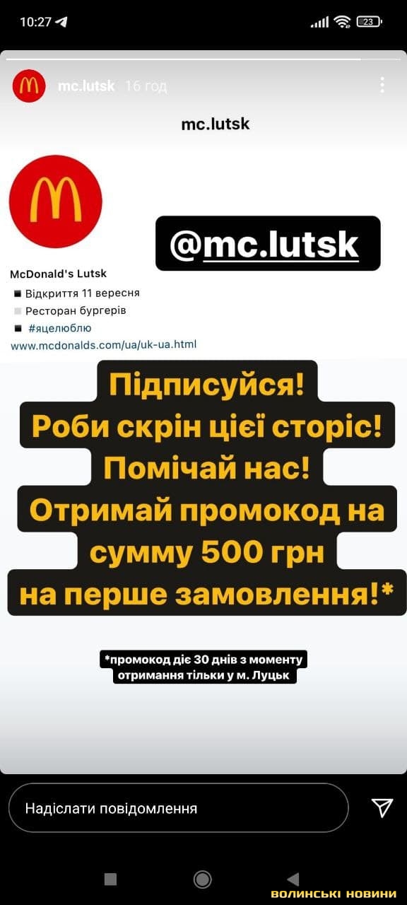 У соцмережі Інстаграм створили фейкові сторінки McDonald’s у Луцьку.