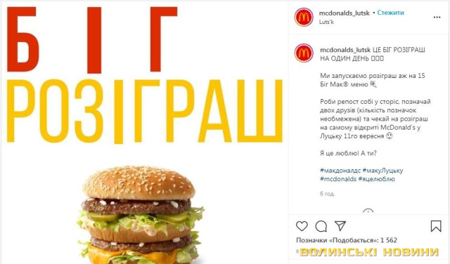 У Луцьку на фейкових сторінках McDonald's у соцмережах проводять великі розіграші