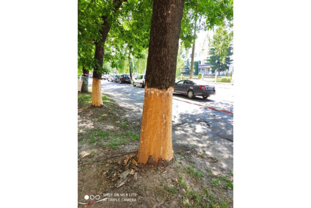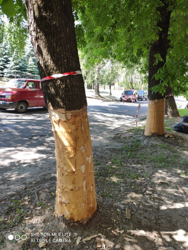 Сьогодні, 9 червня, працівники мунварти та відділу екології міської ради перевірили пошкодження дерев в рядовій посадці за цією адресою. З'ясувалося, що пошкоджені два ясені – повністю зрізана кора навколо стовбурів дерев на висоту 1 м 20 см.
