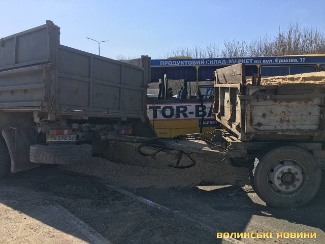 В автопригоду потрапила приміська маршрутка № 107. У неї пошкоджена права частина, а також від удару вилетіло лобове скло. Вантажівка отримала значні механічні ушкодження передньої частини. По дорозі розсипався пісок, яким був навантажений автомобіль.