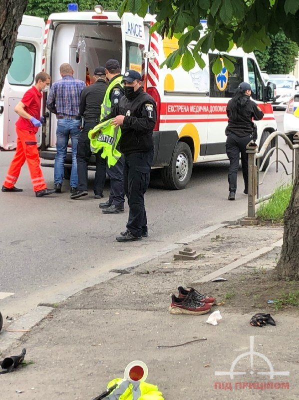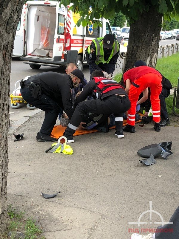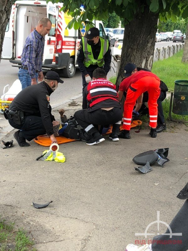 Молодий хлопець-мотоцикліст отримав значні травми. Його забрала швидка. З молодика від удару злетіло взуття.