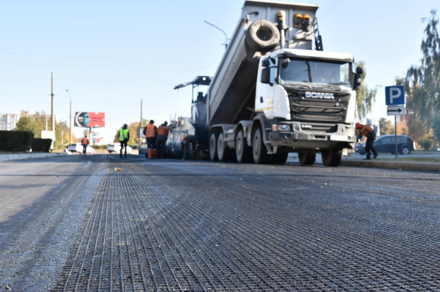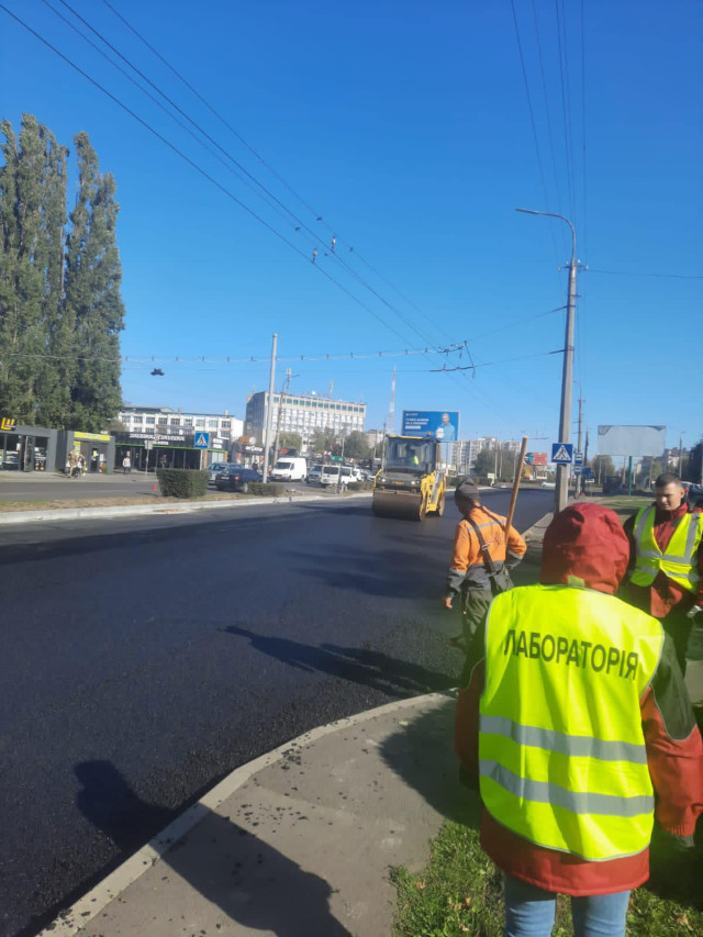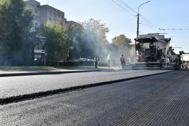 Вкладання верхнього шару асфальту проводять на проспекті від кільця біля ринку «Північний» до перехрестя з проспектом Молоді.