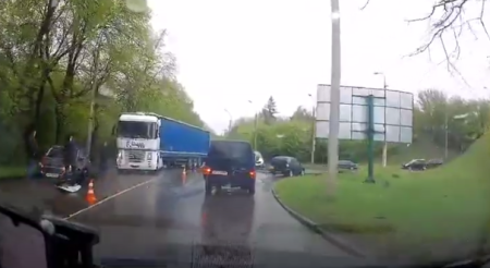 Знак стоїть біля Консульства, у бік Метельницького, у зворотній бік його не має, фура не порушувала, і плюс у неї була головна. Її просто не пропустили, та ще й з горба.