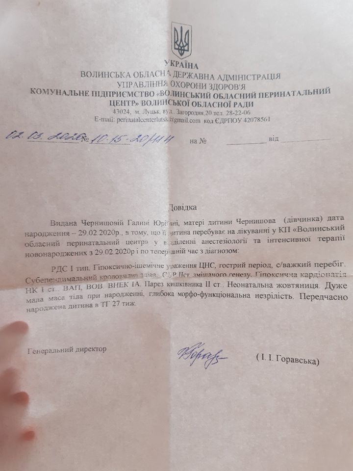 «Для того, щоб жити, «дюймовочці» потрібне спеціальне лікування, препарати і харчування. На жаль, держава цим батьків не забезпечує! Велике прохання до всіх, хто прочитає цей пост, підтримати фінансово дівчинку і батьків, бо без нас вони не справляться! Інформацію перевірив особисто!» – звертається до небайдужих Володимир.Разом із тим, як повідомила очільниця КП «Волинський обласний перинатальний центр» Ірина Горавська, 29 лютого 2019 року Галина Чернишова народила дівчинку, яка перебуває на лікуванні у відділенні анестезіології та інтенсивної терапії медичної установи з дня народження і до цього часу. У дитини дуже мала маса тіла при народженні, глибока морфо-функціональна незрілість. Дівчинка народилася на терміні 27 тижнів.