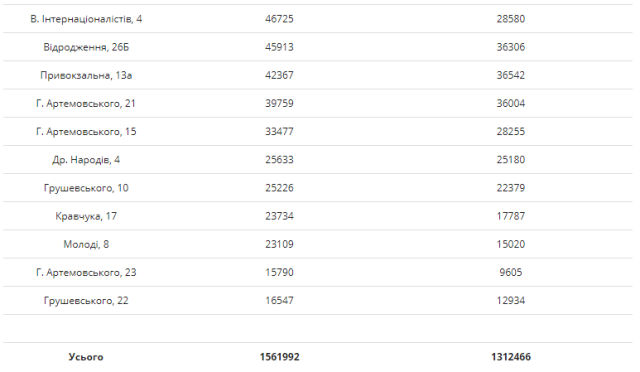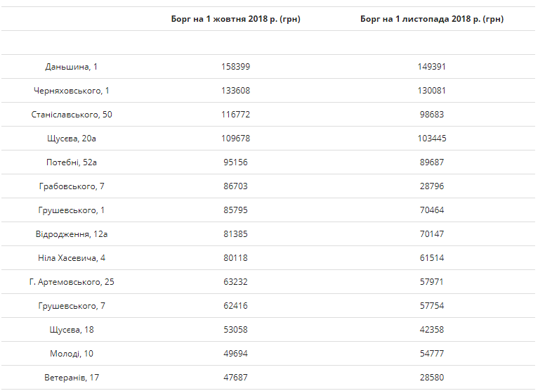 У будинку на вул. Даньшина, 1, кажуть у водоканалі, мешканці заборгували найбільшу суму – 158 399 грн. Сьогодні цей борг зменшився до 149 391,68 грн. Доволі значну суму заборгованості оплатили мешканці будинку по вул. Грабовського, 7, де заборгованість становила 86 703 грн, а сьогодні – лише 28 796 грн. Мешканці вул. Г. Артемовського, 23, із попередньою заборгованістю в 15 790 грн, на сьогодні боргують лише 9 605 грн.