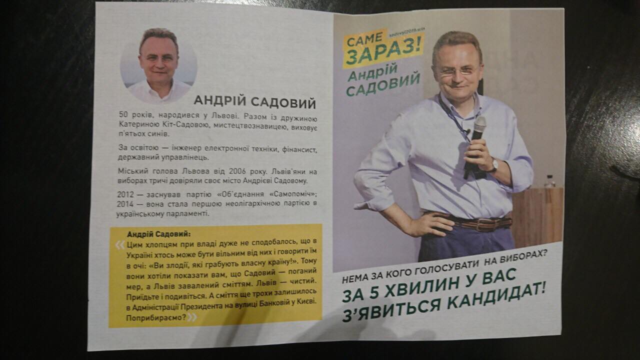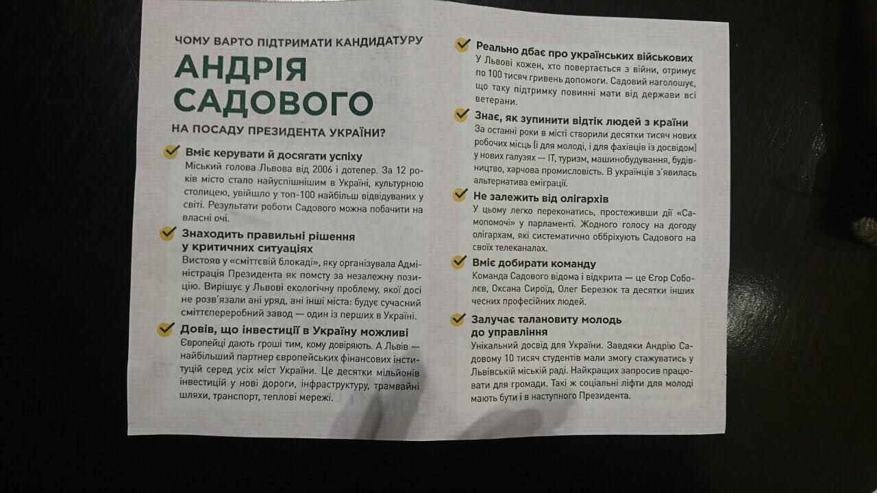 У Луцьку на центральній пішохідній вулиці міста невідомі «агітатори» роздавали листівки на користь кандидата у Президенти України Андрія Садового («Об’єднання «Самопоміч») без вихідних даних.