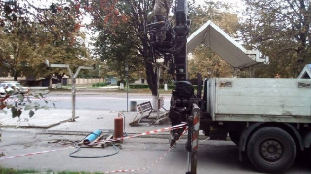 Для повного демонтажу старих металевих конструкцій муніципалам довелося двічі виїжджати на місце. Спочатку зрізати аварійне накриття та стовпи-опори, а потім – основу.