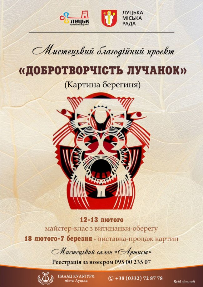 З 18 лютого по 7 березня відбудеться виставка творчих робіт «Добротворчість лучанок». Витинанки будуть експонуватися впродовж двох тижнів у мистецькому салоні «Артист». На офіційній сторінці Палацу культури міста Луцька у мережі facebook відбуватиметься відкритий аукціон робіт.