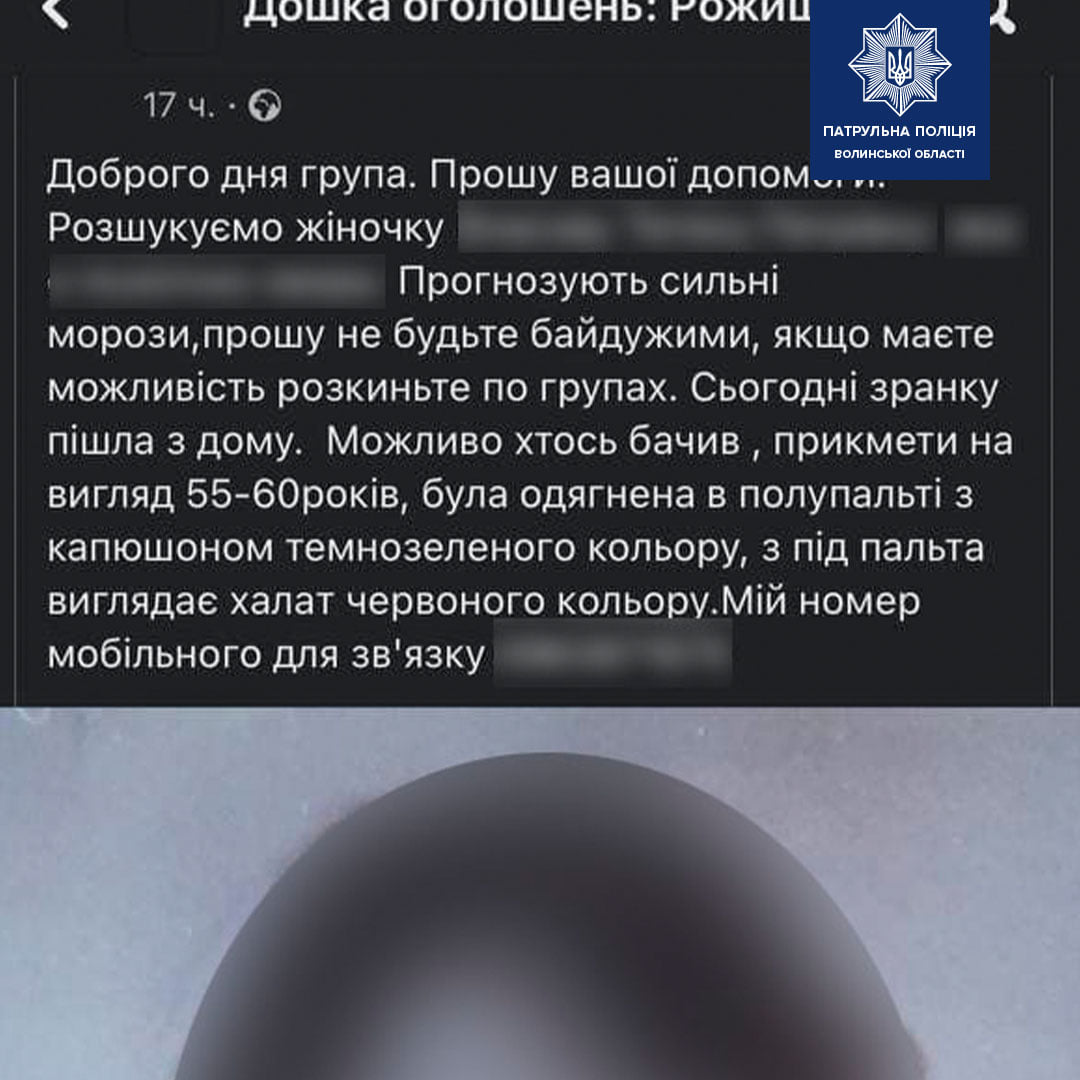 Сьогодні, 16 січня, на лінію 102 звернулася небайдужа громадянка, яка повідомила, що на проспекті Перемоги йде жінка, схожа на ту, яку розшукують за оголошенням у соцмережах.