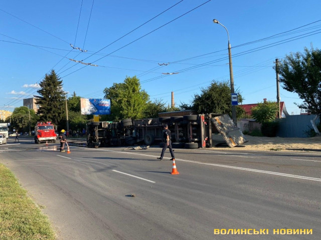 Зі слів очевидців водій тягача з прицепом, вщент наповненим зерном, рухався вулицею Ковельською в напрямку в'їзду в Луцьк, проте, ймовірно, не розрахував безпечну швидкість. У результаті чого автомобіль перевернувся.