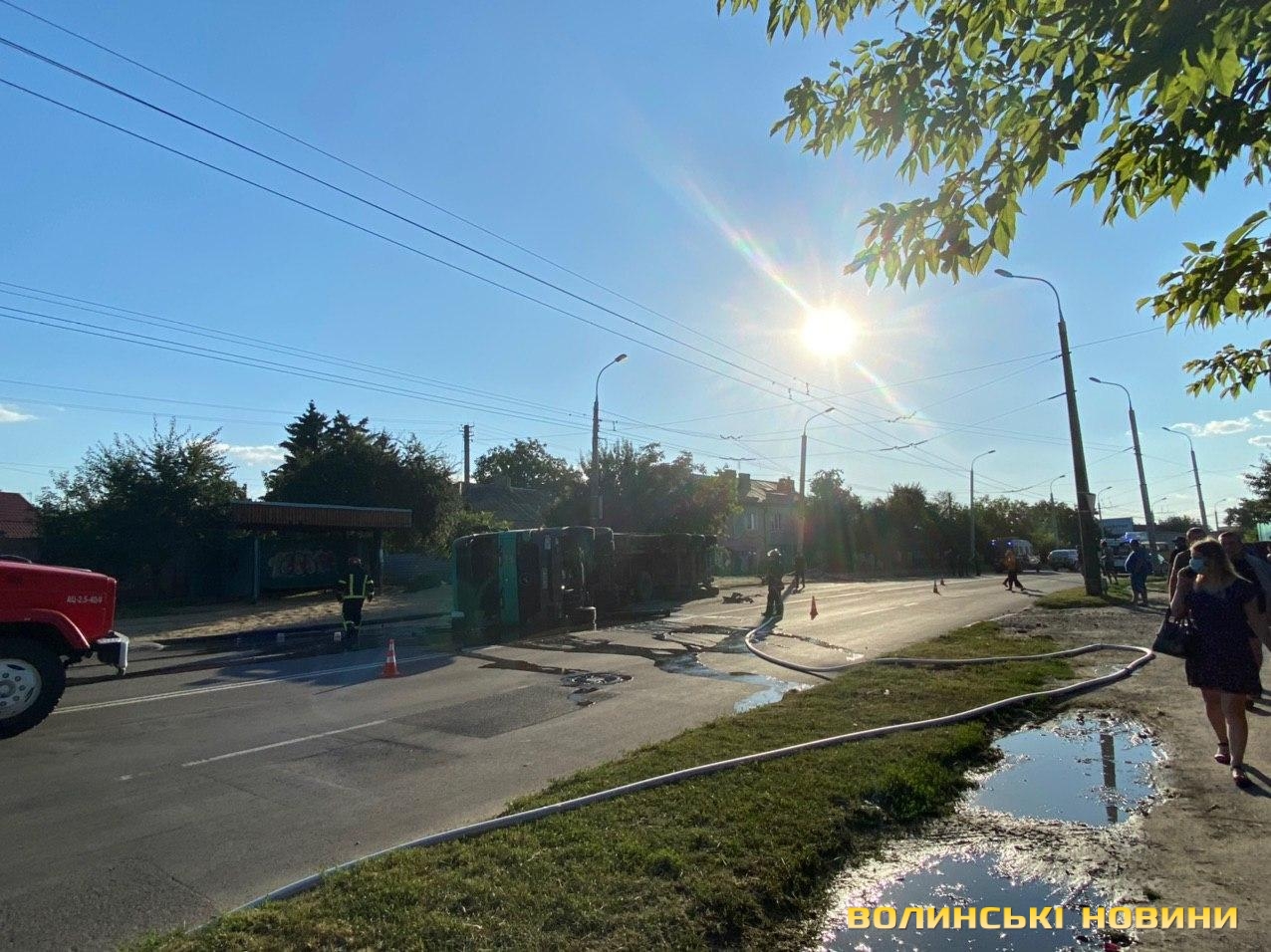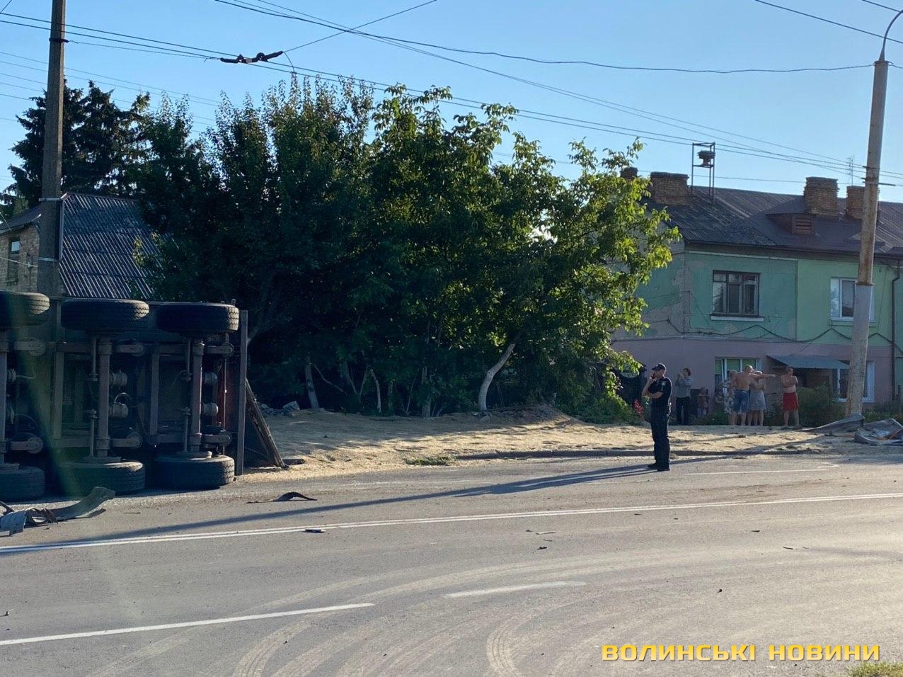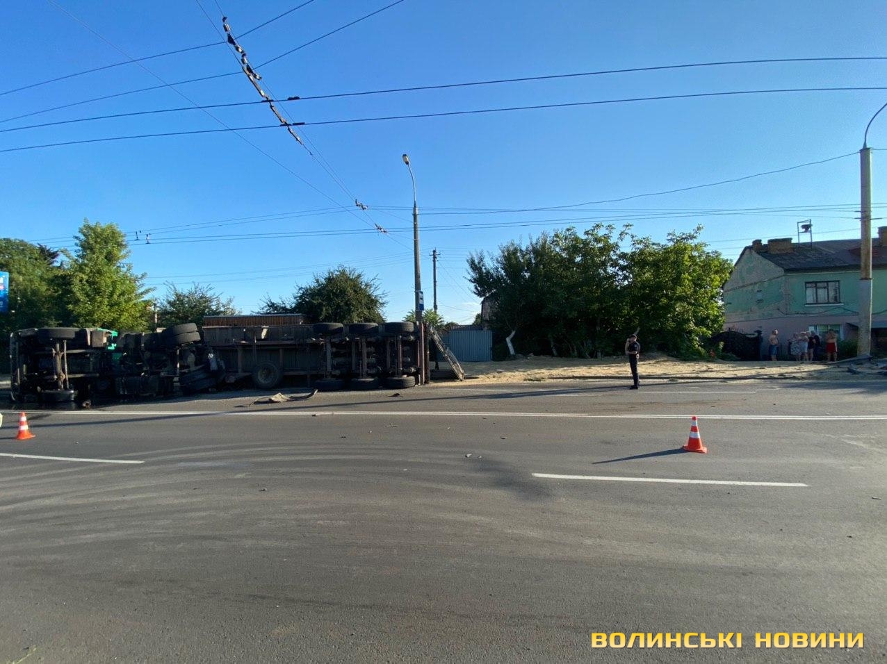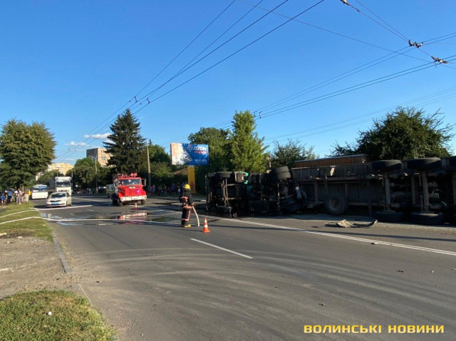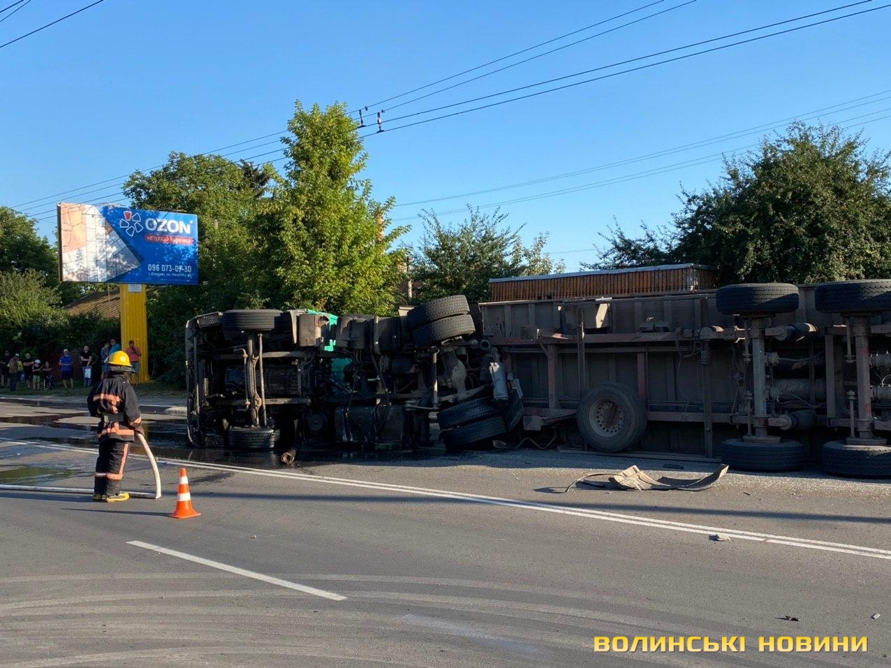 Зі слів очевидців водій тягача з прицепом, вщент наповненим зерном, рухався вулицею Ковельською в напрямку в'їзду в Луцьк, проте, ймовірно, не розрахував безпечну швидкість. У результаті чого автомобіль перевернувся.