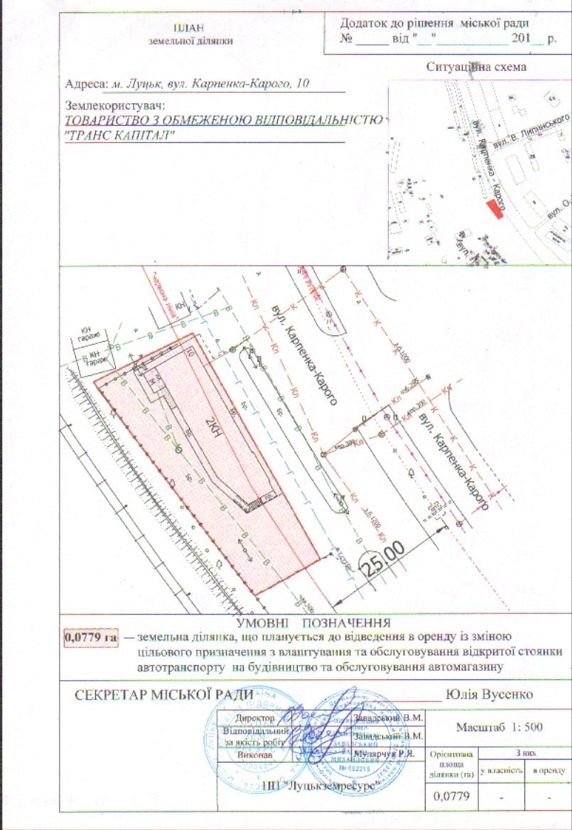Депутати розглянули проект рішення про надання ТзОВ «Транс Капітал» дозволу на розробку проекту землеустрою щодо відведення земельної ділянки на умовах оренди за адресою вулиця Карпенка-Карого, 10 площею 8 сотих із зміною цільового призначення з влаштування та обслуговування відкритої стоянки автотранспорту на будівництво та обслуговування автомагазину.