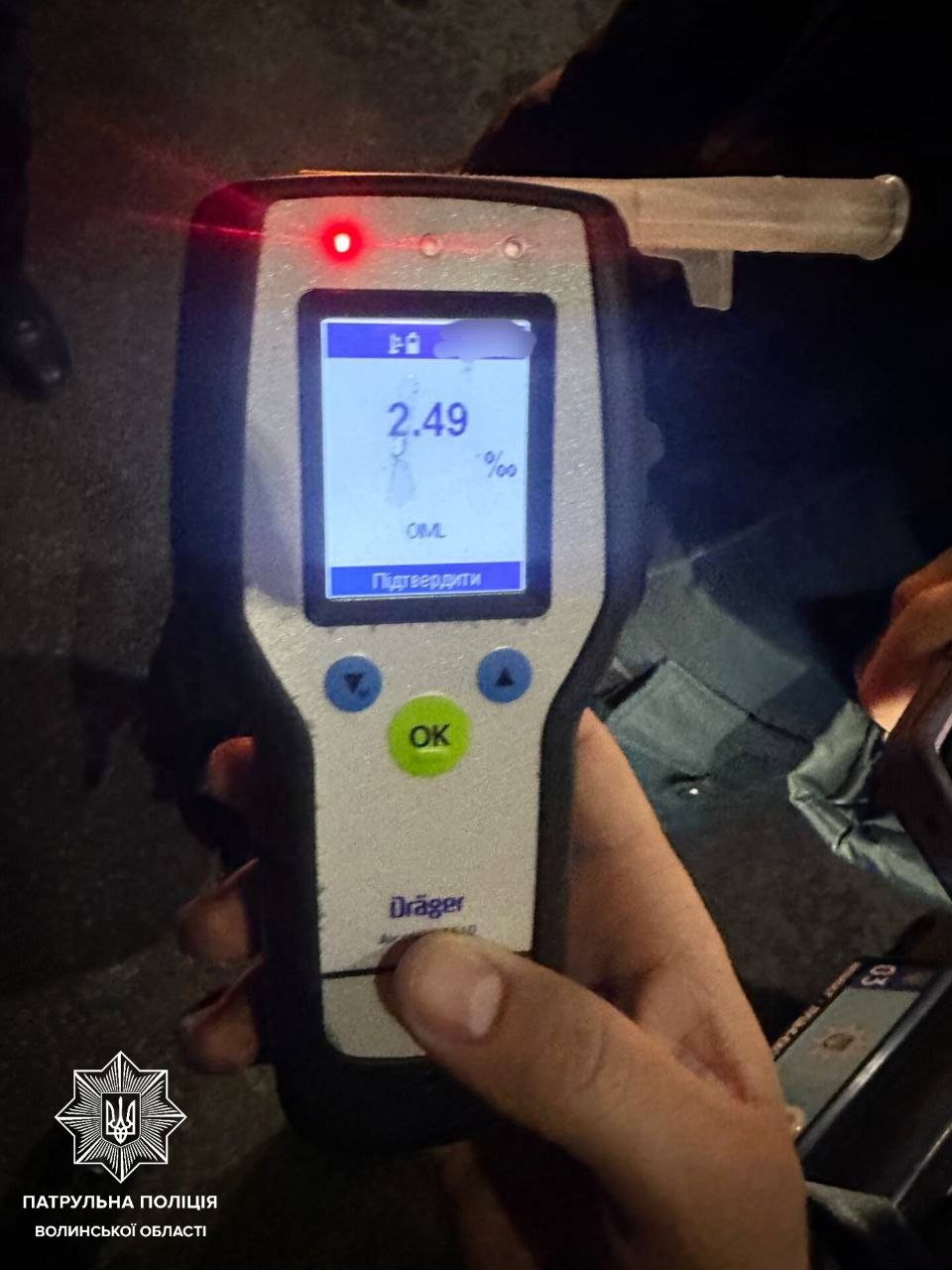 У жінки також були виявлені ознаки алкогольного сп’яніння, і вона погодилася пройти огляд за допомогою приладу Драгер на місці події. Результат становив 2,49 проміле, що перевищує максимально допустиму норму в майже 13 разів.