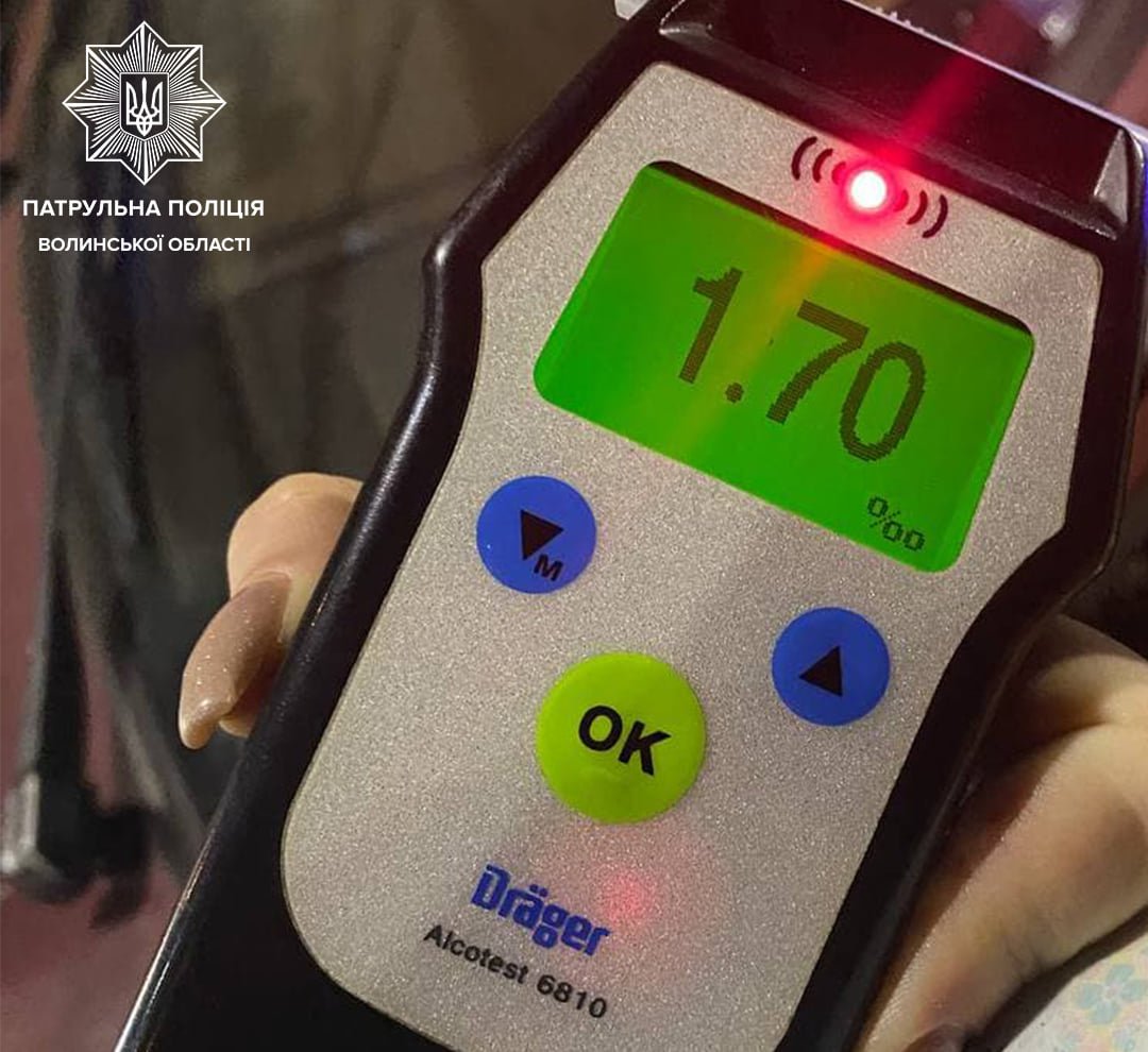 Так, кермувальника Renault Scenic патрульні виявили на проспекті Грушевського. 62-річний чоловік порушив ПДР, а згодом під час спілкування поліцейські виявили в нього ознаки алкогольного сп’яніння. Результат огляду на місці зупинки – 1,70 проміле, що у 8 разів перевищує допустиму норму.