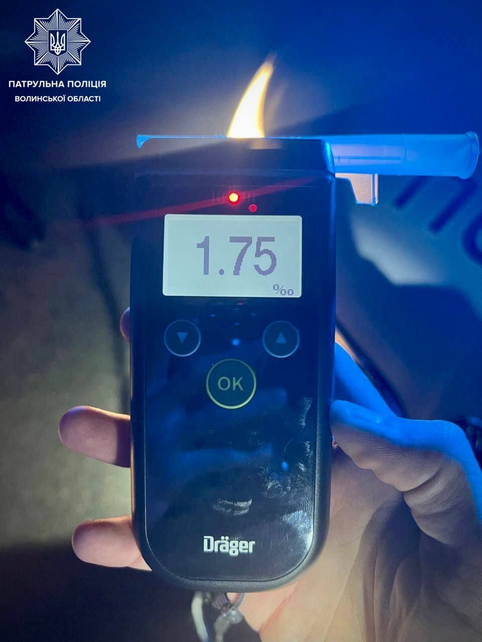 Громадянин мав ознаки сп’яніння, тому поліцейські запропонували йому пройти огляд. Результат на приладі Drager – 1, 75 проміле.На порушників патрульні склали адміністративні матеріали згідно із вчиненими правопорушеннями, зокрема, за ст. 130 (Керування у стані сп’яніння) КУпАП.