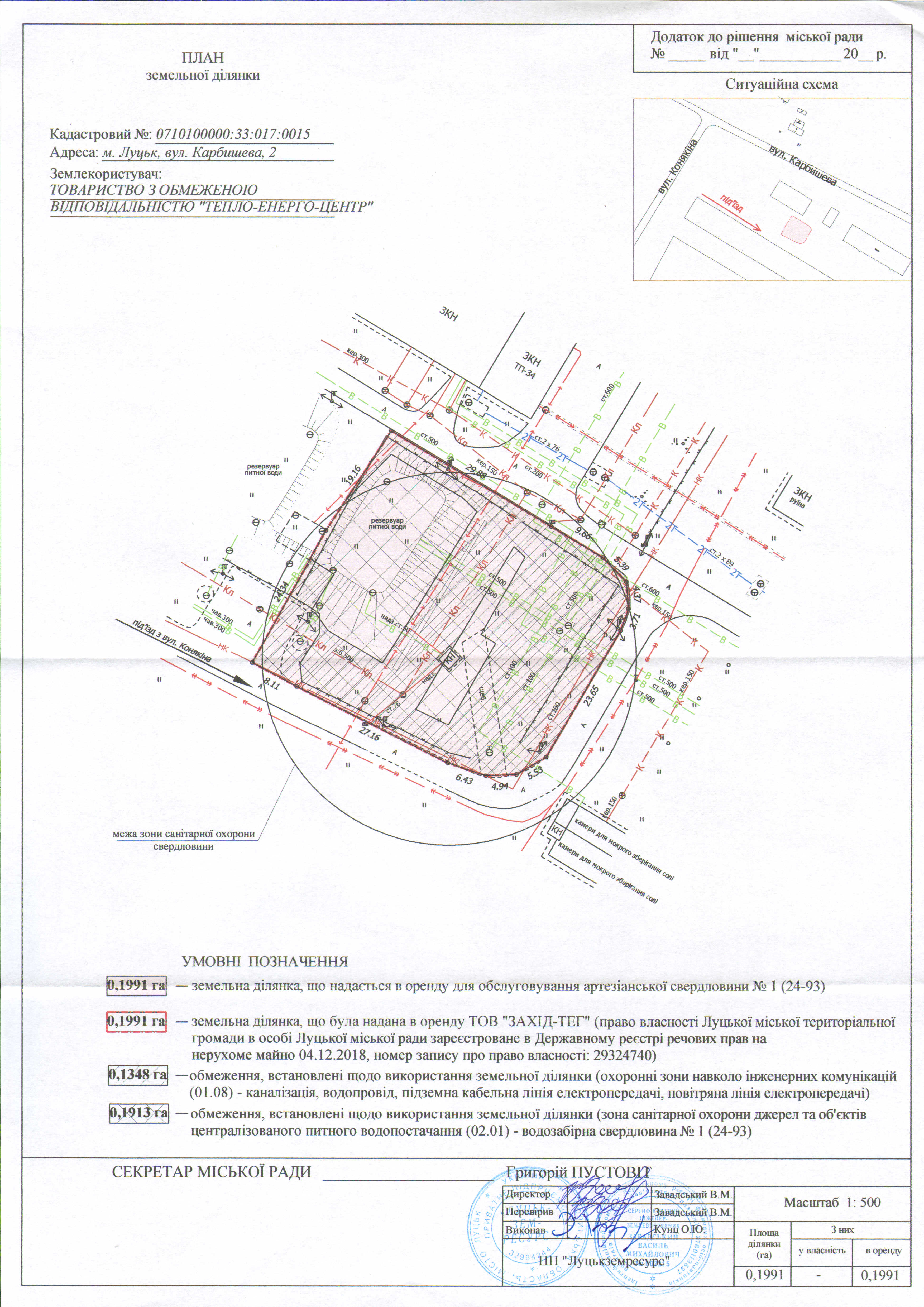 Як пояснив начальник управління земельних ресурсів Луцької міської ради Сергій Шабала, до членів профільної комісії звернулися члени ТзОВ «Теплоенергоцентр» із проханням передати їм на умовах оренди земельну ділянку для обслуговування артезіанської свердловини № 1 на вул. Карбишева, 2.Зі слів посадовця, право власності Луцької міської територіальної громади, від імені якої діє Луцька міська рада, на земельну ділянку площею майже 20 соток, зареєстроване у Державному реєстрі речових прав на нерухоме майно від 4 грудня 2018 року.