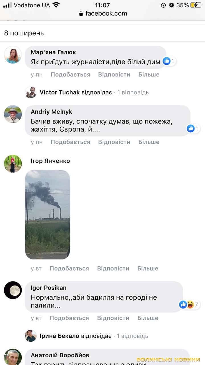 Фото і відео чорного диму, який йде з труби заводу, лучани постійно публікують в соцмережах. На кадрах видно, що зовсім поруч біля зеленої зони, де гуляють мешканці з дітьми, з труби йде чорний дим.Під час розширеної оперативної наради у міськраді, Луцький міський голова дав протокольне доручення департаменту економічної політики спільно з управлінням екології підготувати і винести на розгляд сесії міськради звернення до Міністерства захисту довкілля і природних ресурсів.