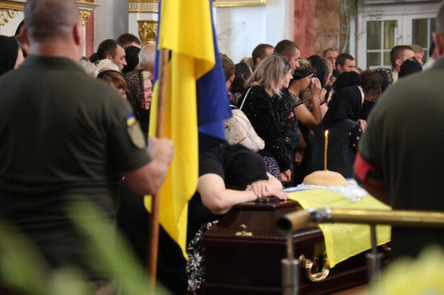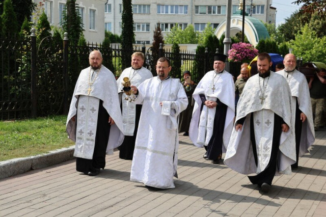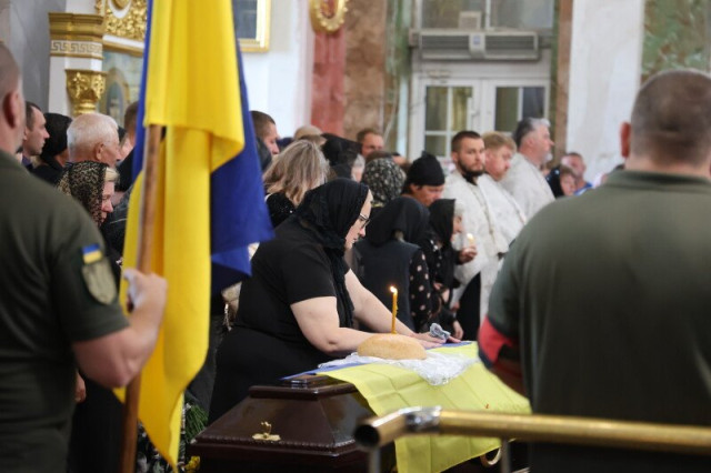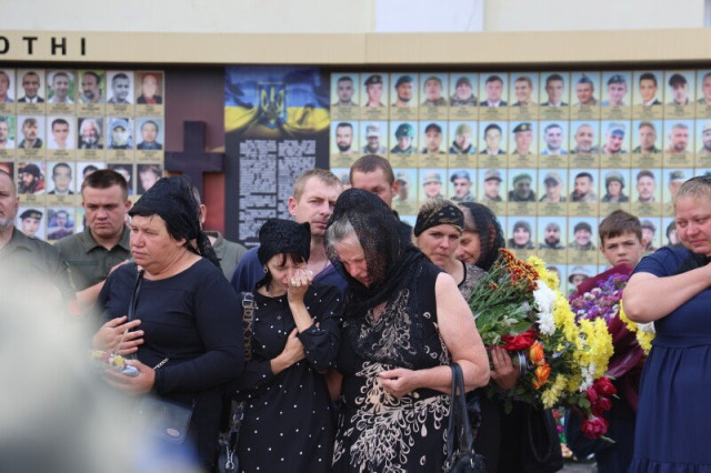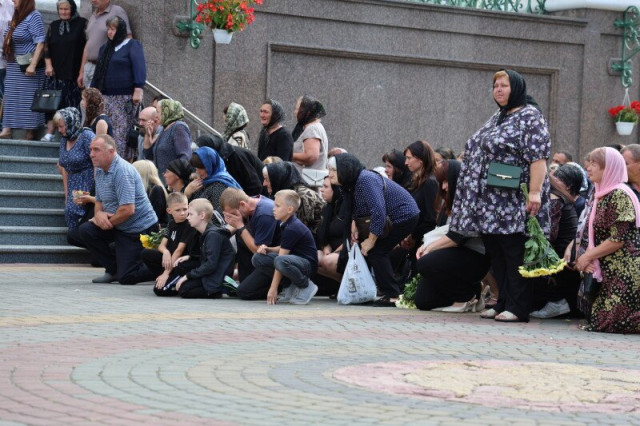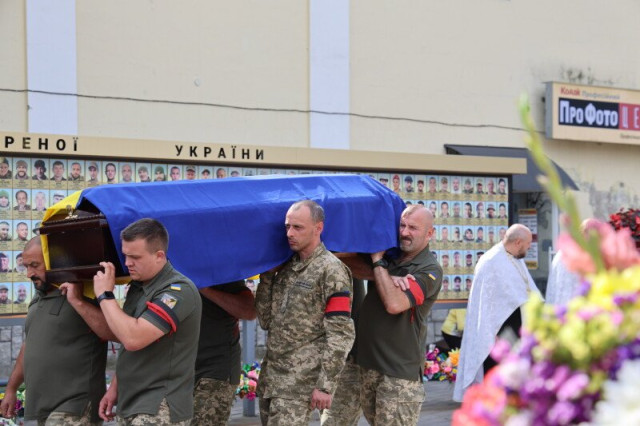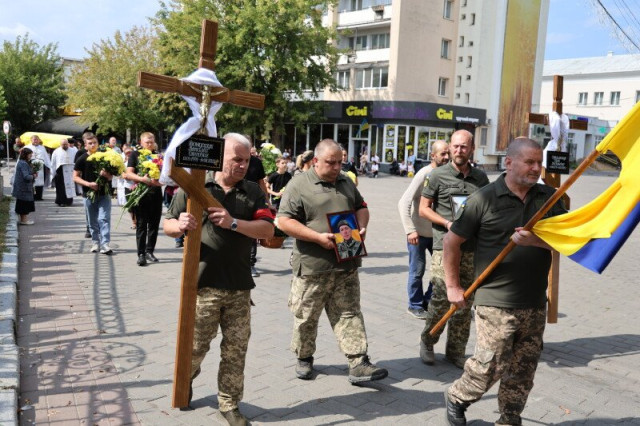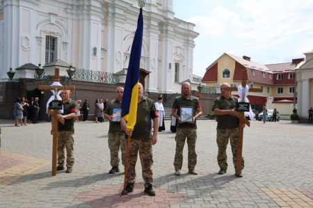 Після завершення заупокійного богослужіння труни з тілами захисників пронесли Театральним майданом. Біля пам’ятного фотостенду загиблим Героям траурна процесія зупинилася і виконала Державний Гімн.