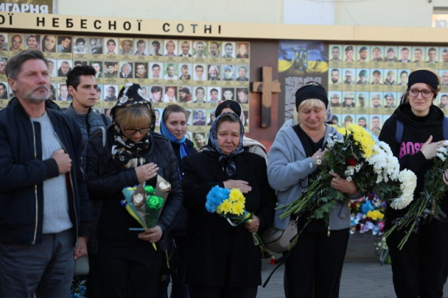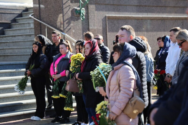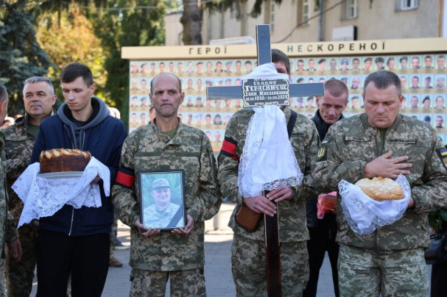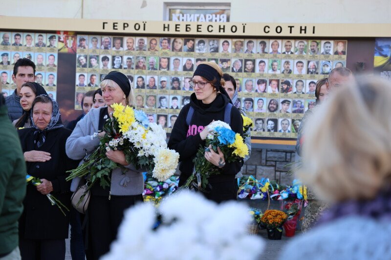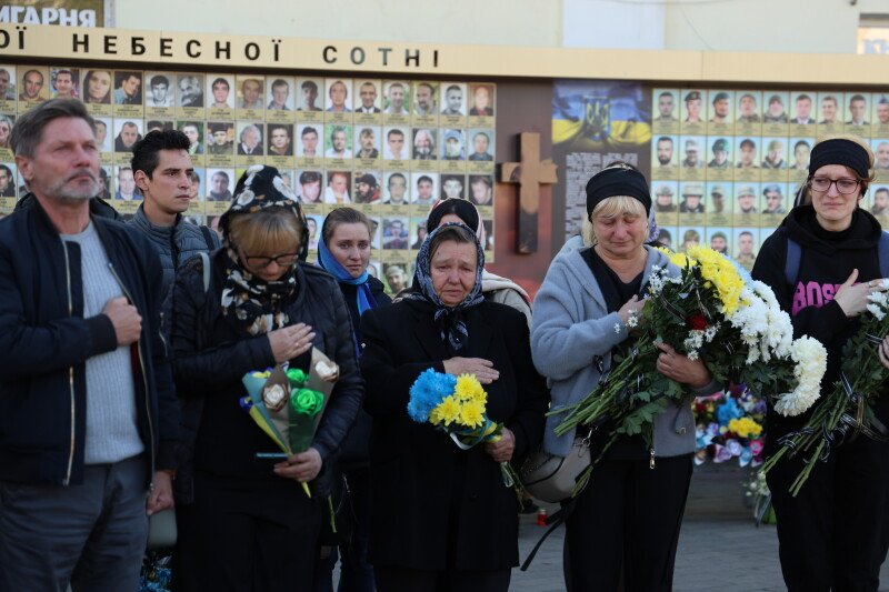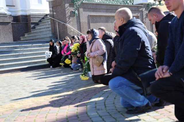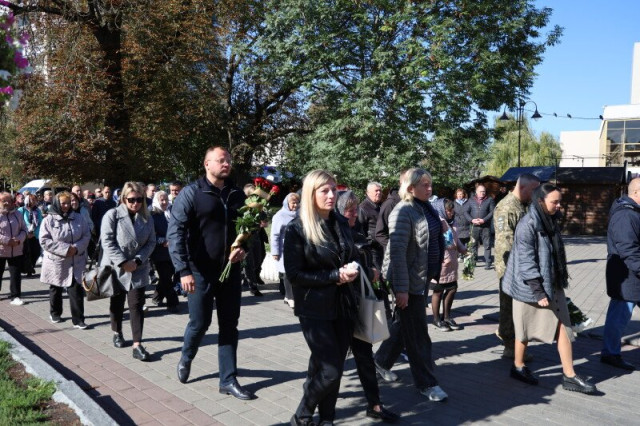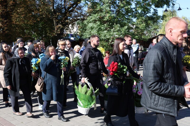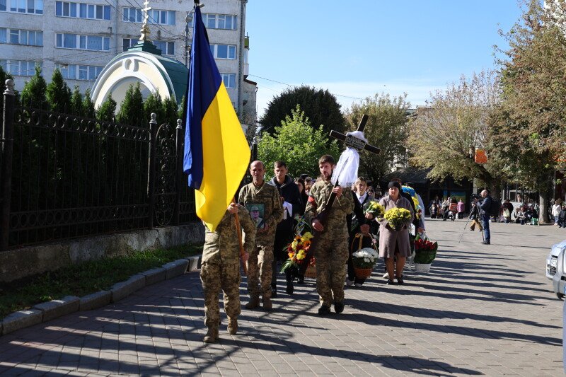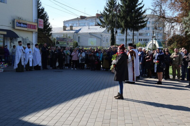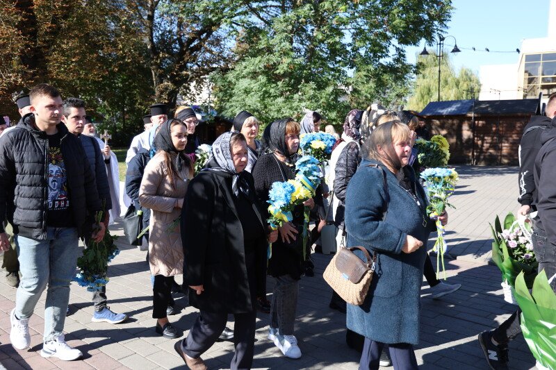 Після завершення богослужіння труну з тілом покійного захисника пронесли Театральним майданом. Біля фотостенда пам’яті загиблих Героїв присутні зупинилися і виконали Державний Гімн України.