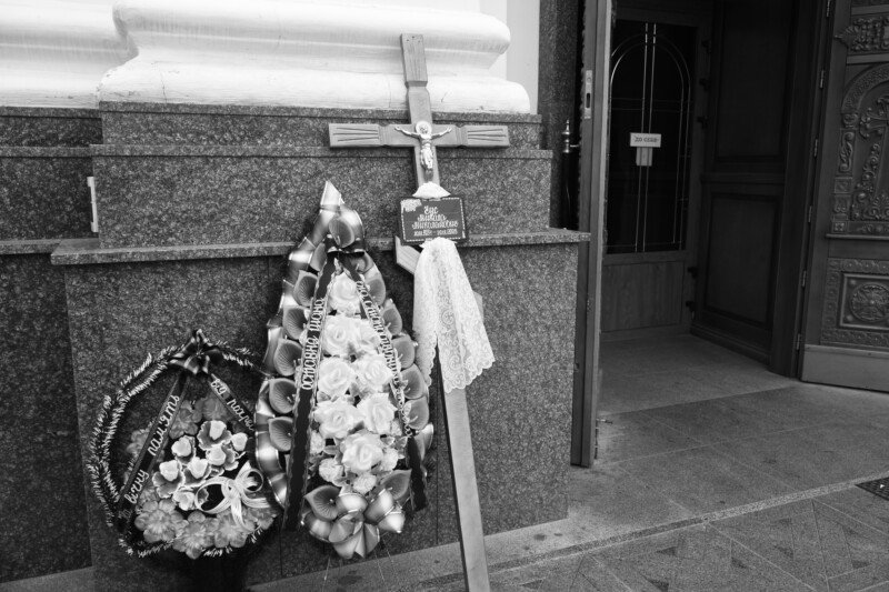Після завершення богослужіння домовину з тілом покійного захисника пронесли Театральним майданом. Біля пам’ятного фотостенда загиблим Героям траурна процесія зупинилися і виконала Державний Гімн.