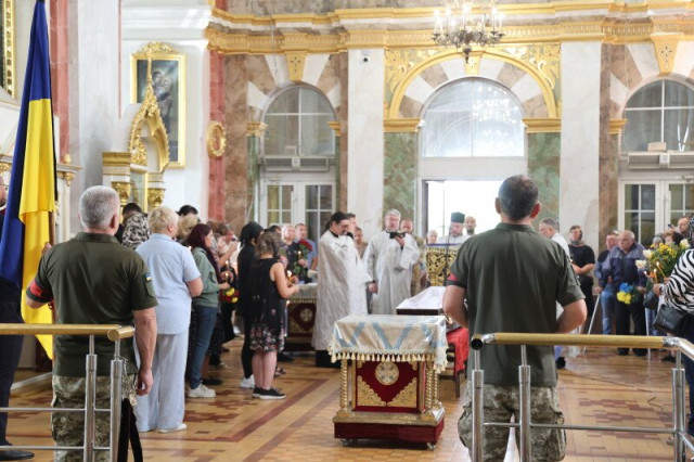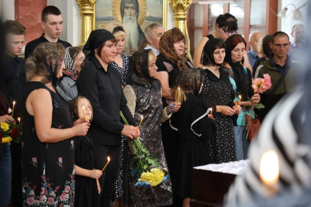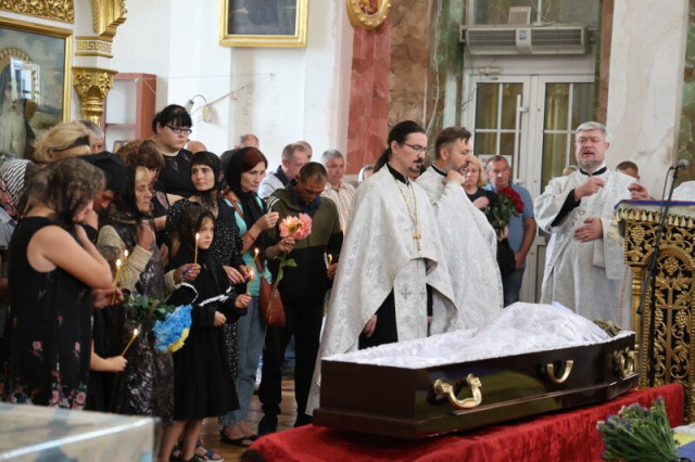 Після завершення заупокійного богослужіння труну з тілом захисника пронесли Театральним майданом. Біля пам’ятного фотостенду загиблим Героям траурна процесія зупинилася і виконала Державний Гімн.
