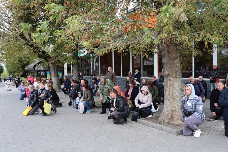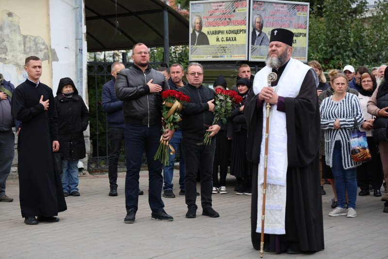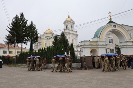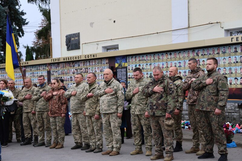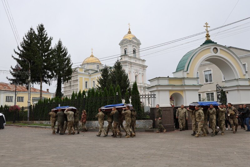 Після завершення богослужіння труни з тілами захисників пронесли Театральним майданом. Біля фотостенду пам’яті загиблих Героїв присутні зупинилися і виконали Державний Гімн України.