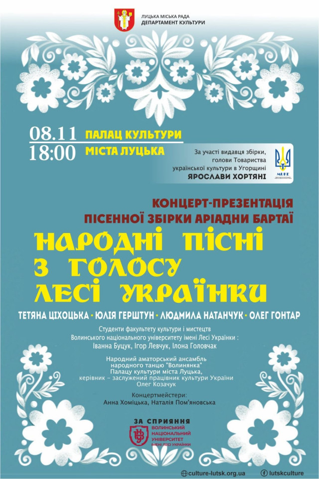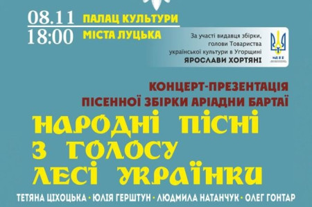 У Палаці культури міста Луцька 8 листопада відбудеться презентація пісенної збірки Аріадни Бартаї «Народні пісні з голосу Лесі Українки». Захід розпочнеться о 18.00.