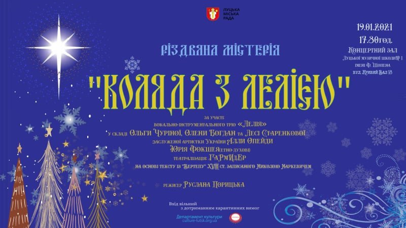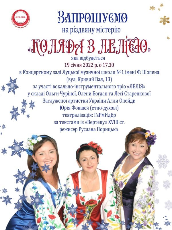 19 січня о 17:30 в концертній залі Луцької музичної школи №1 імені Фридерика Шопена відбудеться різдвяна містерія «Коляда з Лелією» за мотивами вертепу XVIII століття, що його записав Микола Маркевич, за участі вокально-інструментального тріо «Лелія» культурно-мистецького центру «Красне», заслуженої артистки України Алли Опейди та театру «ГаРмИдЕр». Режисер – Руслана Порицька.
