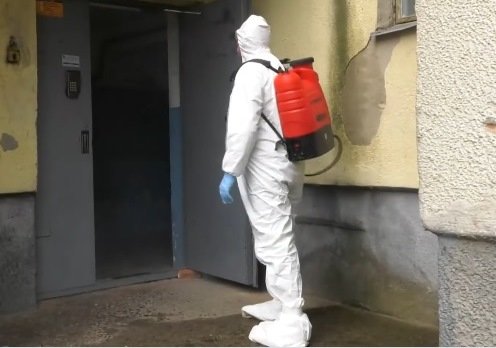 У захисних костюмах та зі спеціальним обладнанням: у Луцьку дезінфікують під’їзди багатоповерхівок.