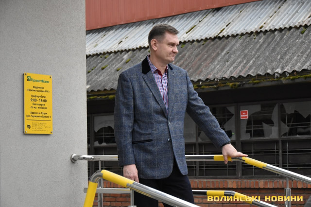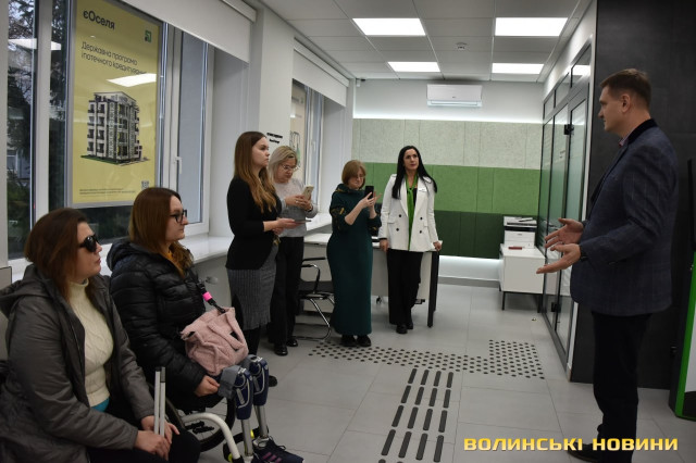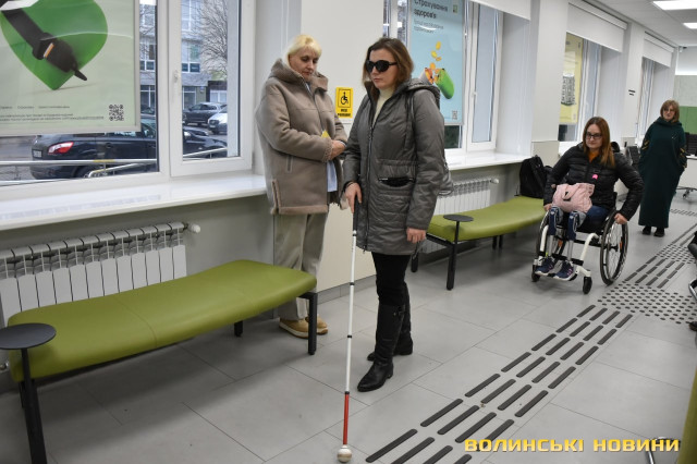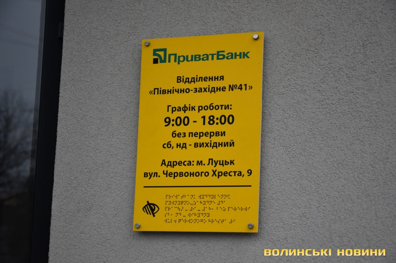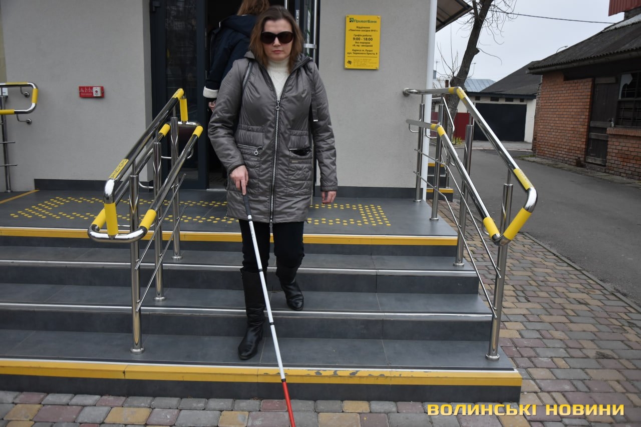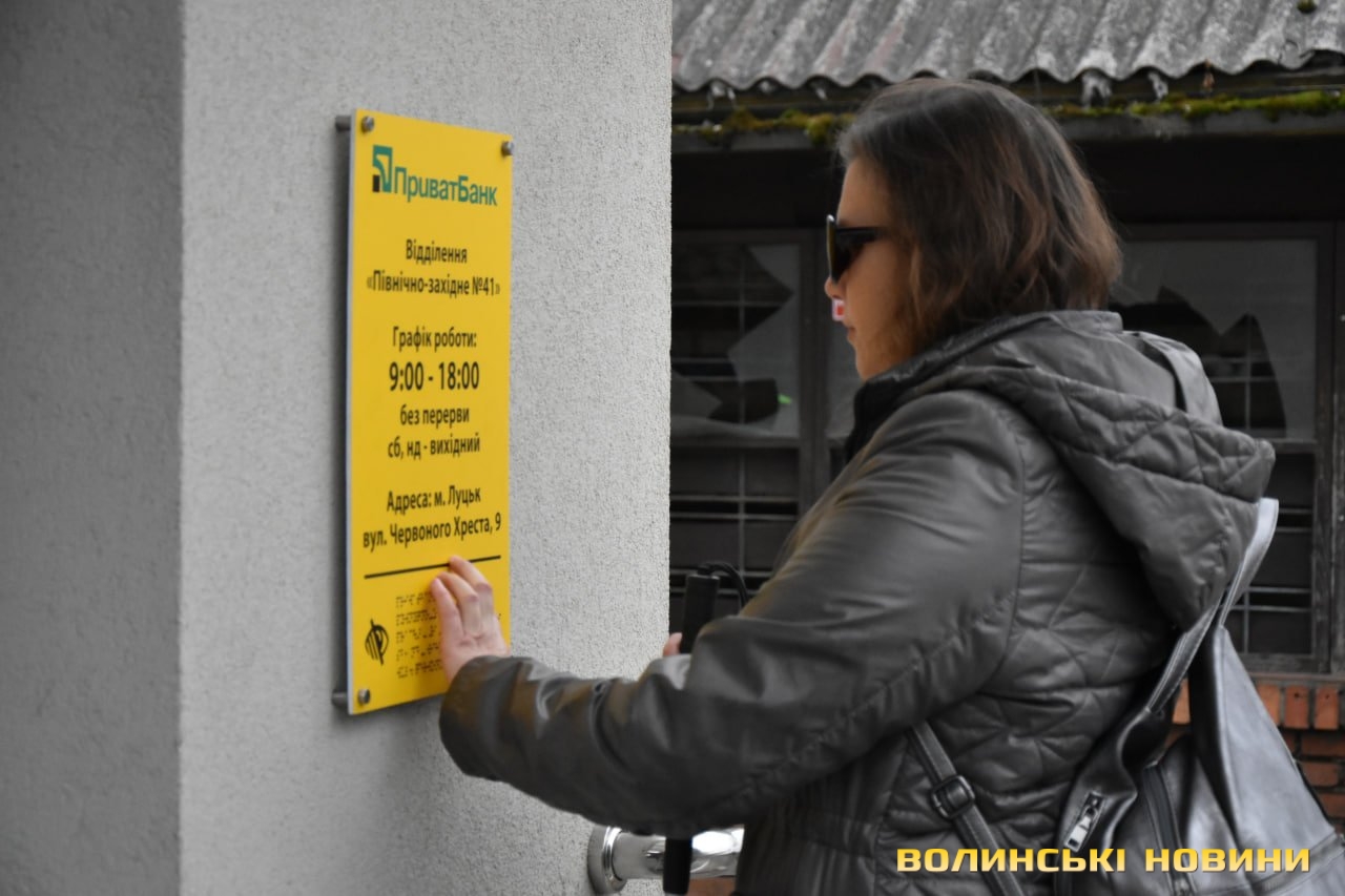 У Луцьку проінспектували перше відділення «ПриватБанку» з підвищеною доступністю для осіб з інвалідністю. Новий підрозділ, який знаходиться на вулиці Червоного Хреста, 9, запустив роботу у вересні цього року. До перевірки на доступність долучилися фахівці та керівництво банку, жителі міста, які користуються кріслом колісним та мають порушення зору, а також журналісти.Перше на Волині банківське відділення підвищеної доступності спроєктоване з урахуванням вимог ДБН та важливими елементами доступності: спеціальним пандусом, розширеними дверними отворами без порогів, просторими коридорами, зручним санвузлом та адаптованою касою, візуальними елементами доступності, тактильними смугами та індикаторами, написами і позначеннями шрифтом Брайля.
