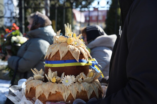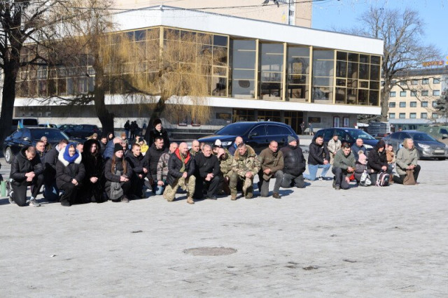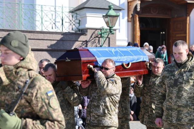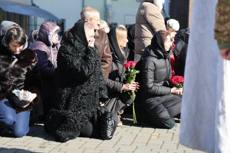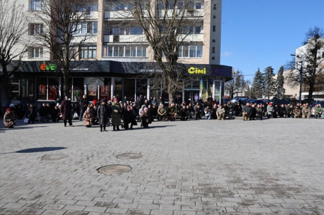 Після закінчення богослужіння труни з тілами захисників пронесли Театральним майданом. Біля пам’ятного фотостенда загиблим Героям траурна процесія зупинилася і виконала Державний Гімн.