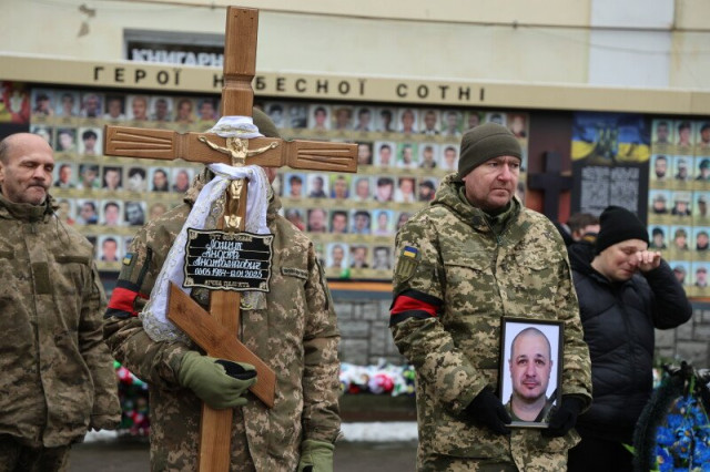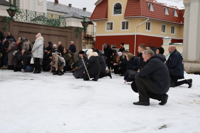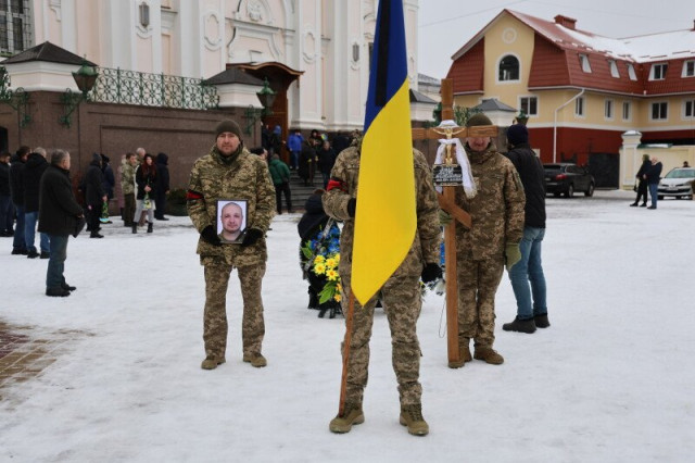 Після завершення богослужіння труну з тілом покійного захисника пронесли Театральним майданом. Біля пам’ятного фотостенда загиблим Героям присутні зупинилися і виконали Державний Гімн України.