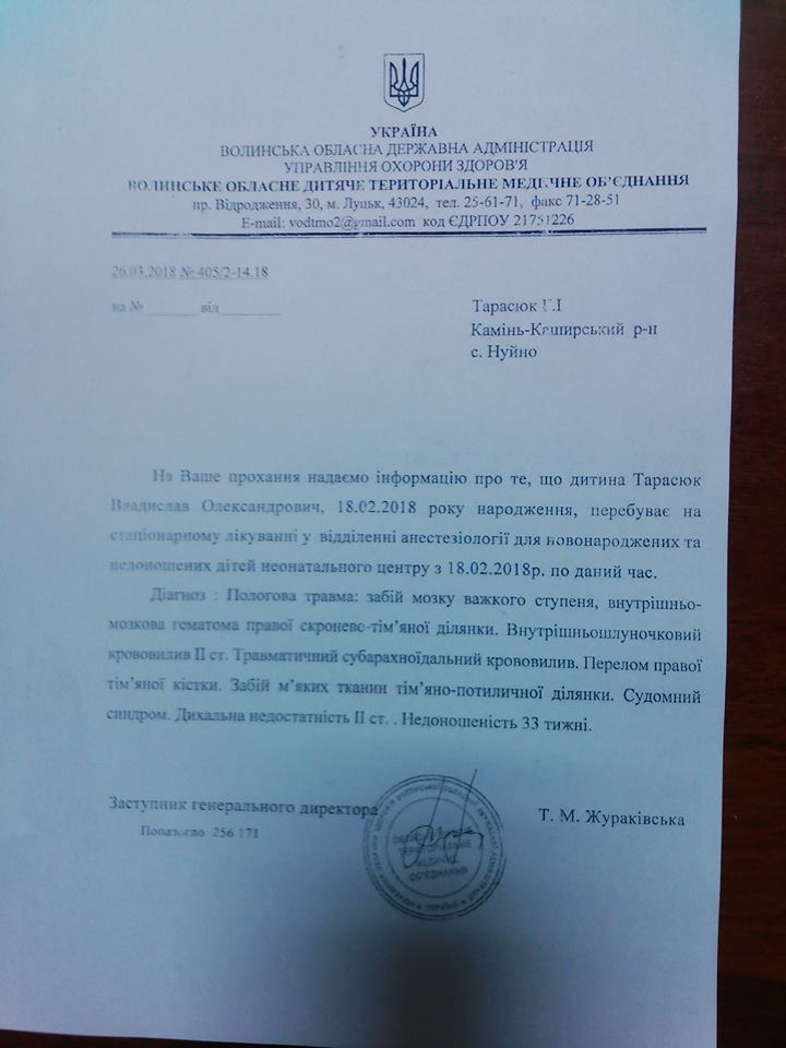 «Хлопчик знаходиться в реанімації Волинської обласної дитячої лікарні. Потрапив туди відразу з пологового, дуже важкий стан, видаляли гематому, робили пересадку шкіри на голові», - йдеться у дописі.