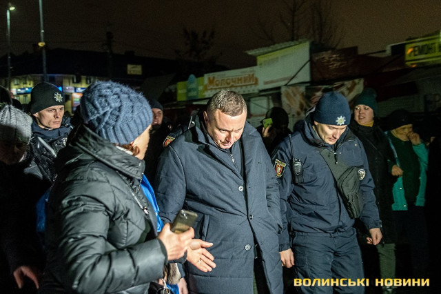 Люди оточили вихід з ряду. У цей час поліції поруч не було.На ринок прибув очільник поліції Волині Петро Шпига, який спілкується з підприємцями.Підприємці Центрального ринку, які протестують проти демонтажу їхніх незаконно розміщених контейнерів, заблокували рух вулицею Глушець.