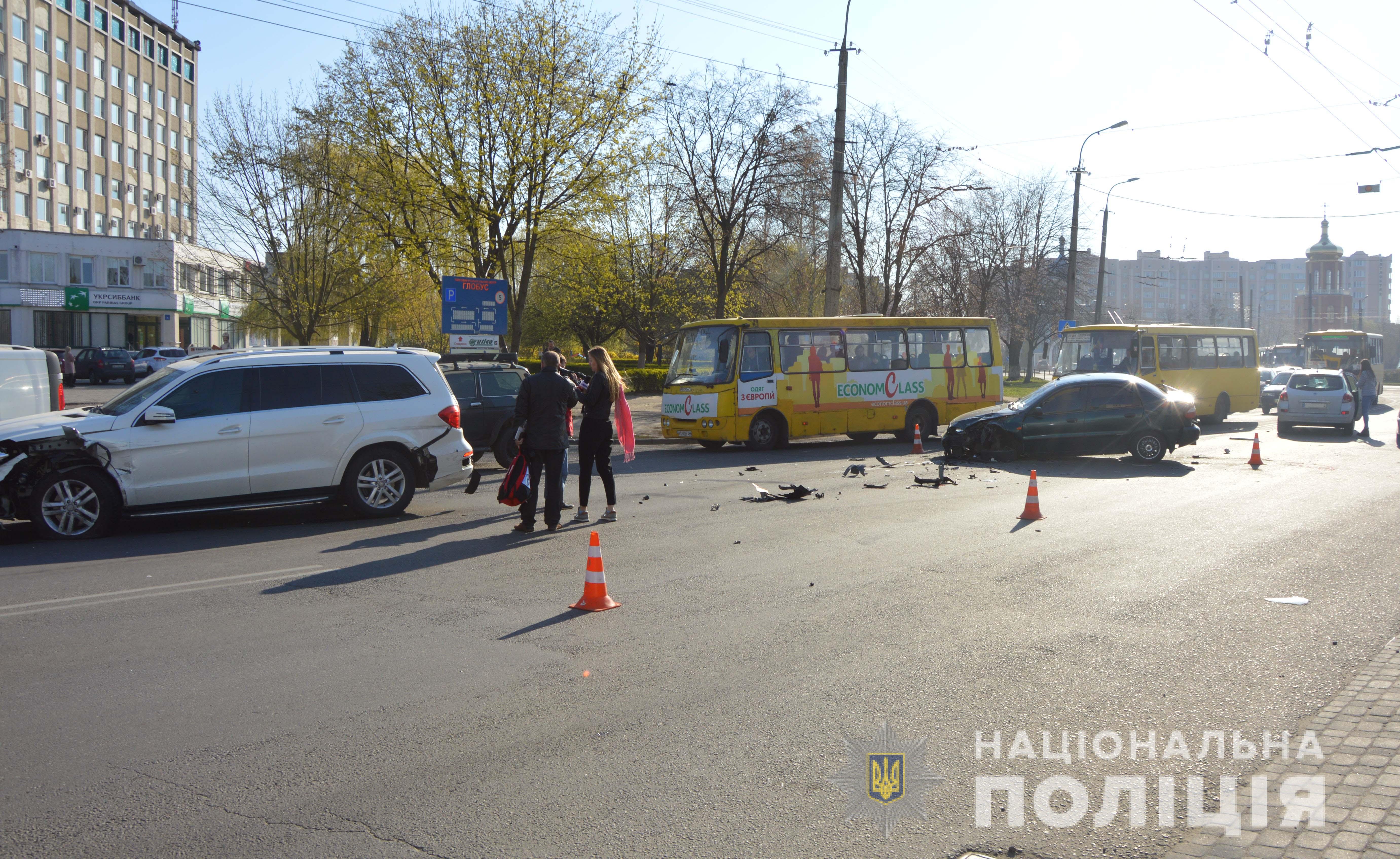Попередньо, поліцейські встановили, що автомобіль «Mercedes Benz GL350», за кермом якого перебував 32-річний житель обласного центру, виїхав на смугу зустрічного руху, де допустив зіткнення з «Renault Clio» та «Daewoo Lanos».