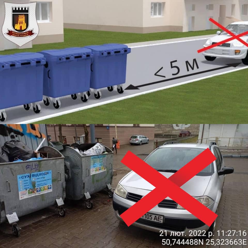 Якщо ви стали свідком паркування авто ближче ніж 5 м від контейнерних майданчиків або контейнерів для збирання побутових відходів, телефонуйте на гарячу лінію «Група швидкого реагування»: 067 000 0 679, 066 102 1 102.