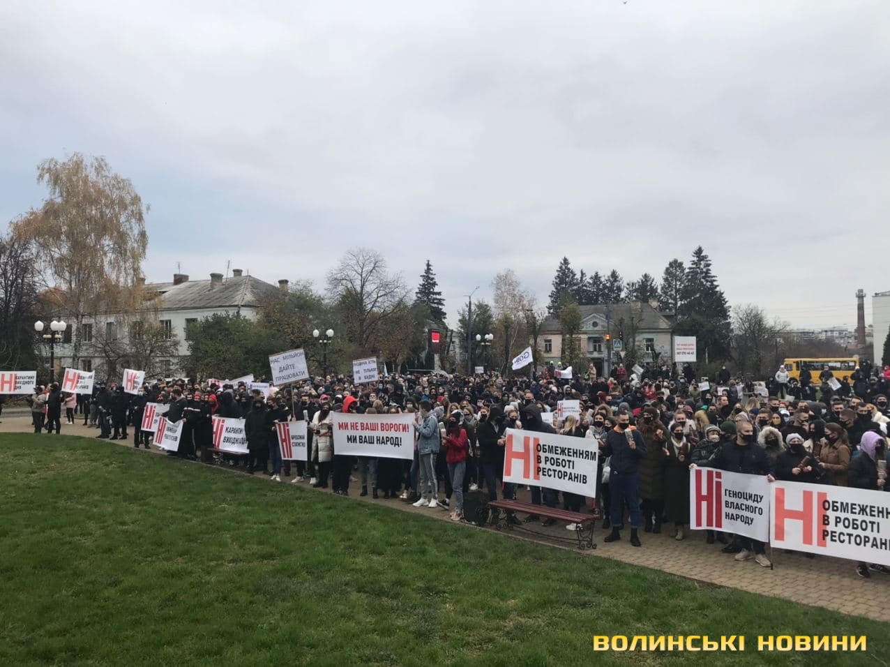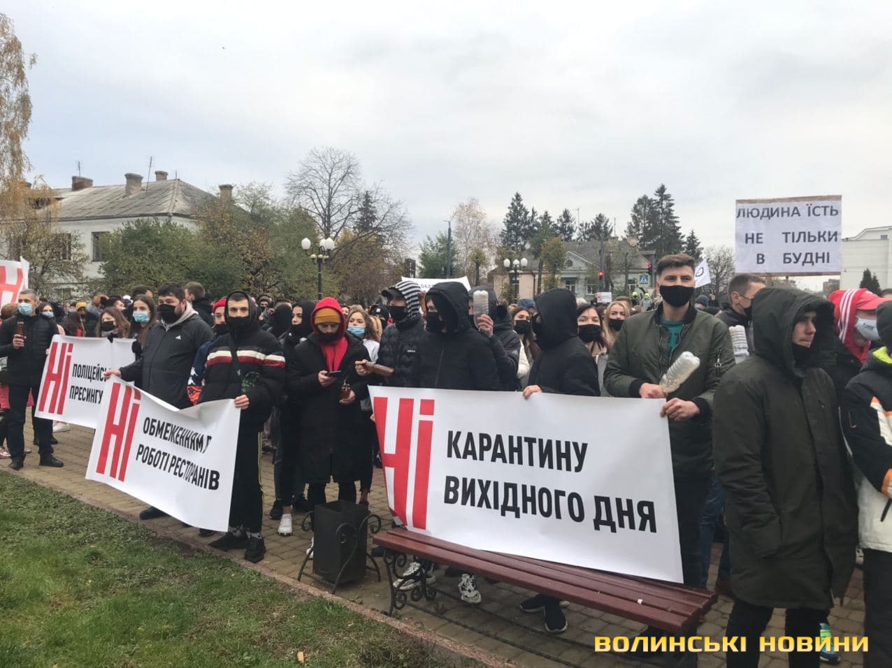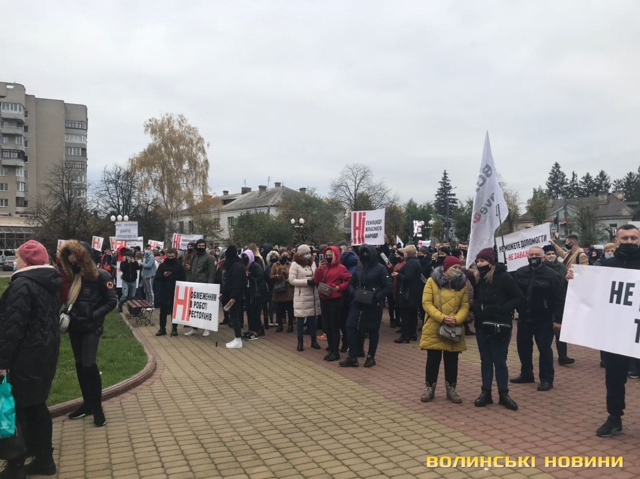 Опісля мітингарі пішли проспектом Волі до приміщення Головного управління Нацполіції області, аби передати звернення міністру МВС Арсену Авакову.Нагадаємо, аби запобігти подальшому стрімкому поширенню коронавірусу, на Волині обмежили час роботи закладів громадського харчування. Усі кафе та ресторани повинні працювати з 7.00 до 22.00. Також планують запровадити карантин вихідного дня, який передбачає, що в суботу та неділю заклади працюватимуть лише на виніс.