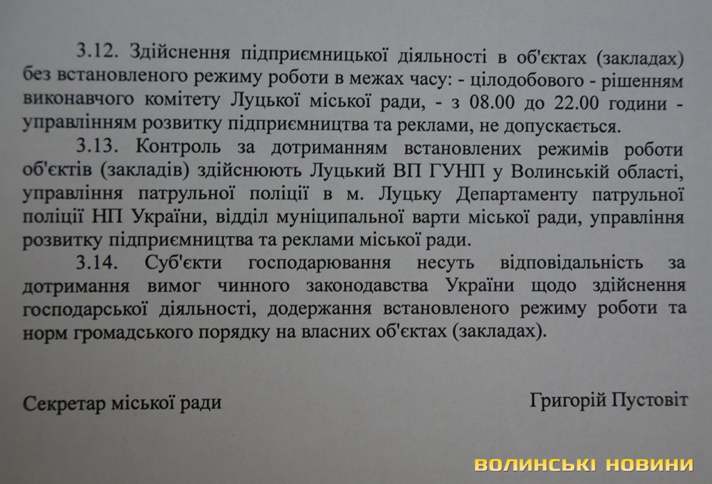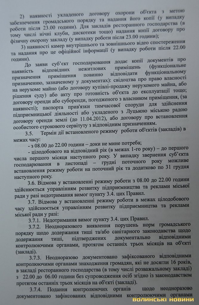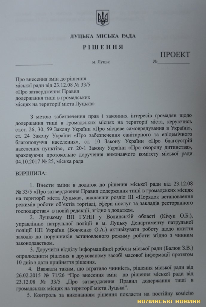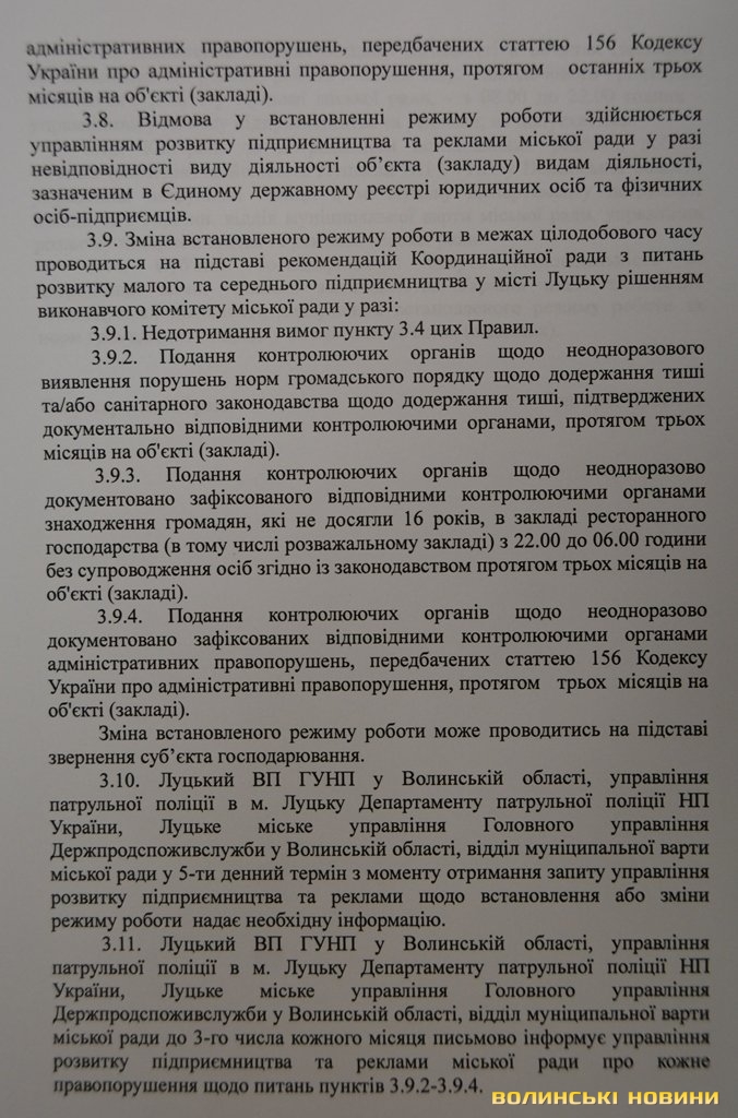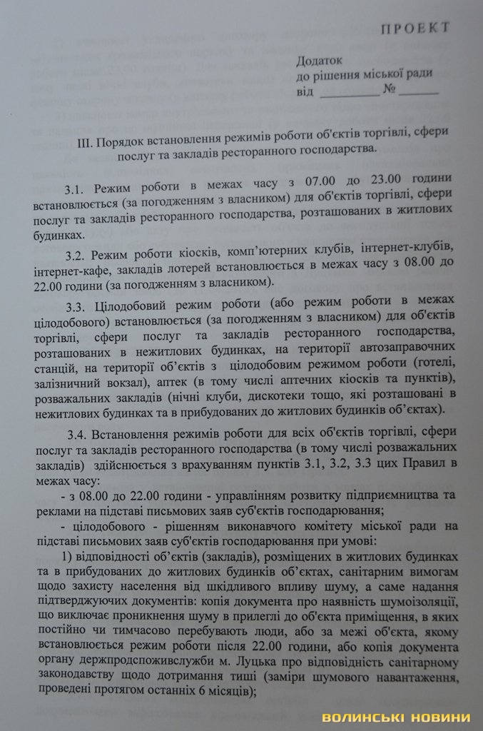 Зміни передбачають й те, що подаючи документи на дозвіл діяльності, суб’єкти господарювання мають нам подати заміри шумового навантаження. Також перед тим, як надати дозвіл працювати після 22:00, ми звертатимемося до поліції, муніципальної варти і Держпродслужби, аби дізнатися, чи не було порушень впродовж останніх 3 місяців. Якщо були, то дозвіл не надаватимемо. Зокрема йдеться про адмінпорушення щодо продажу алкоголю та тютюну», - інформувала Наталія Рибай.Працівник Луцького міськвідділу поліції Федір Дроздик зауважив, що вони складають протоколи про порушення, але їх скасовують.