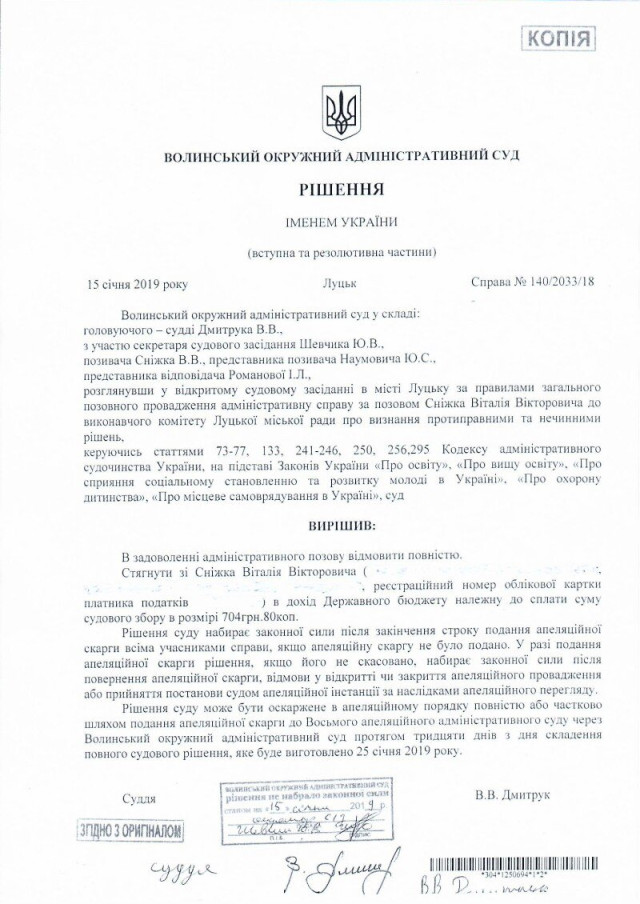 За результатами розгляду судом прийнято рішення, яким відмовлено в задоволенні позову Віталія Сніжка, йдеться на сайті Луцькради.