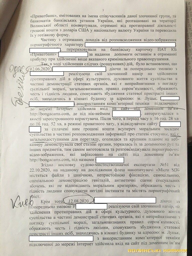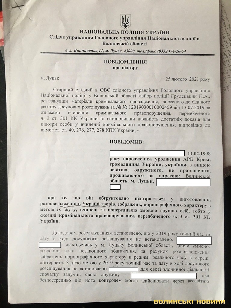 Натомість трьом дівчатам з Луцька та чоловіку однієї з них правоохоронці повідомили про підозру за статтею 301 КК України (ввезення, виготовлення, збут і розповсюдження порнографічних предметів). Правоохоронці тиснуть на вебкам-моделей, аби ті підписали угоди про визнання винуватості, проводячи незаконні обшуки та демонструючи відео їхнім родичам.