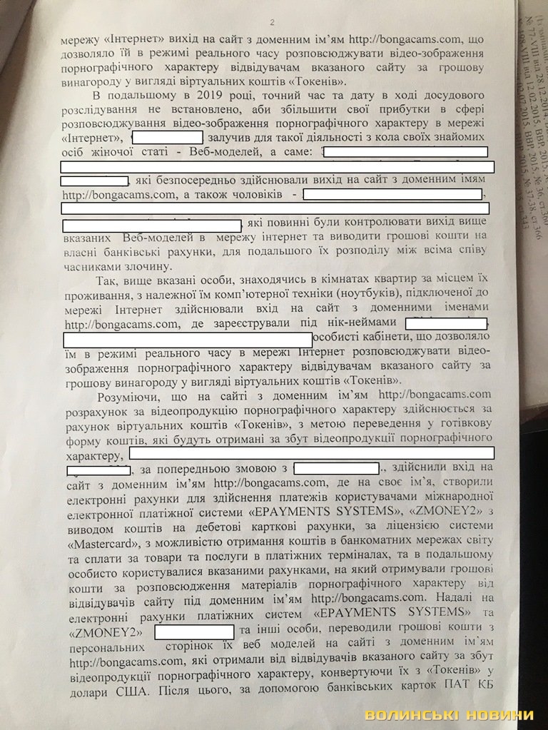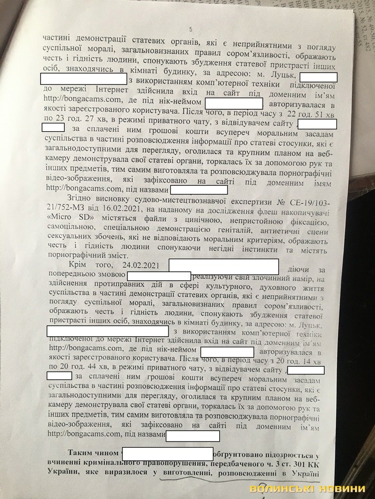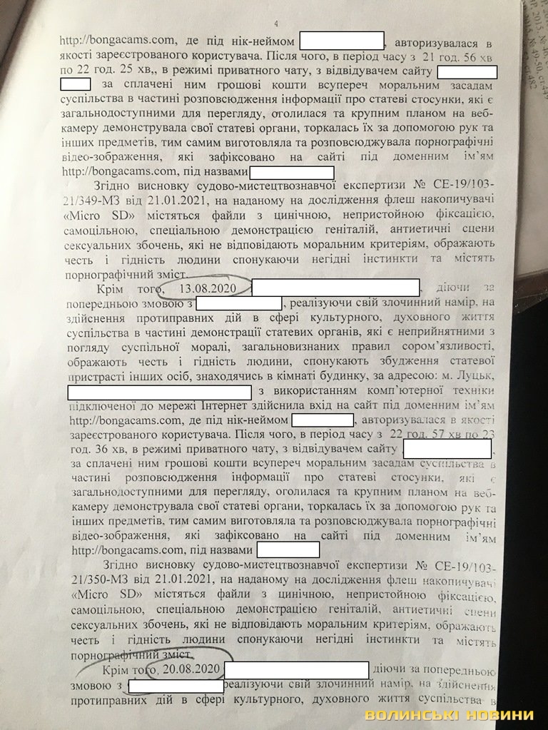 В обласному центрі Волині у розповсюдженні порно підозрюють трьох вебкам-моделей, які зареєструвалися на профільному сайті та проводили онлайн-трансляції, роздягаючись на камеру. Специфіка сайту передбачає інтимне онлайн-спілкування з користувачами, однак все це відбувається приватно, а самі відео, які відтворюються у режимі реального часу, належать безпосередньо сайту, а не моделям. Відтак дівчата просто не могли зберегти їх файлами на певні носії та, відповідно, розповсюдити.