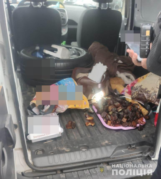 В результаті проведення поверхневої перевірки, відповідно до ст. 34 Закону України «Про Національну поліцію» в багажнику автомобіля інспектори виявили близько 3-х кілограмів каміння, зовні схожого на бурштин.