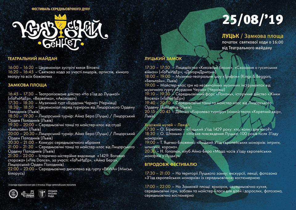 25 серпня, вже вчетверте, у Луцьку дзвенітиме підковами, мечами і кубками, співатиме, танцюватиме і блазнюватиме, смакуватиме, цвістиме і пахнутиме фестиваль середньовічного духу «Князівський бенкет».